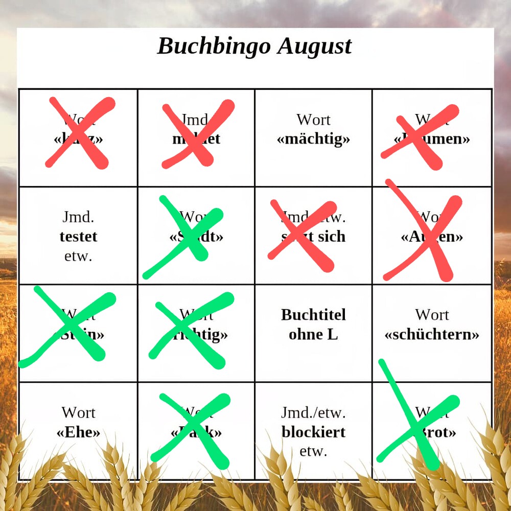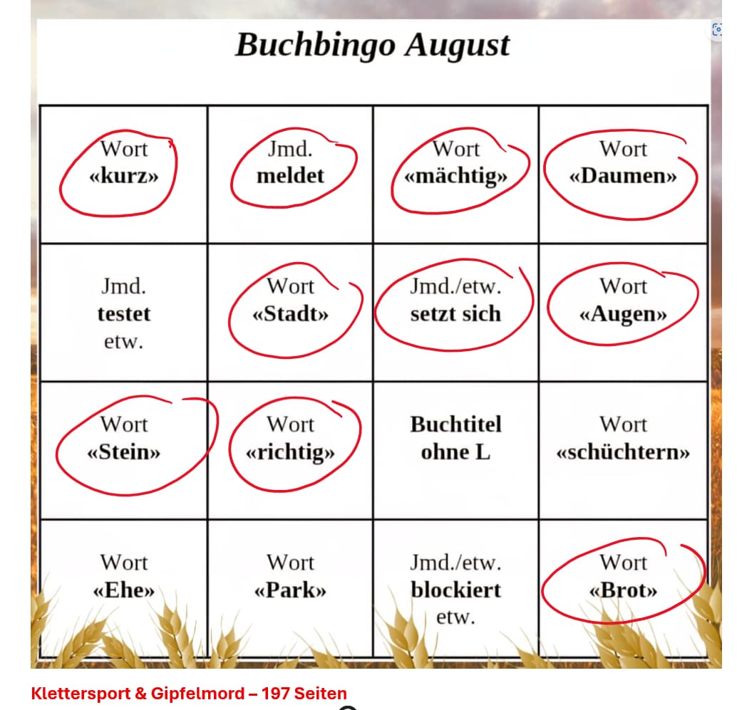So nun folgt auch noch mein Resultat. Ich habe gesamthaft 197 Seiten gelesen und mein Ziel übertroffen. Für ein Bingo hat es knapp gereicht.