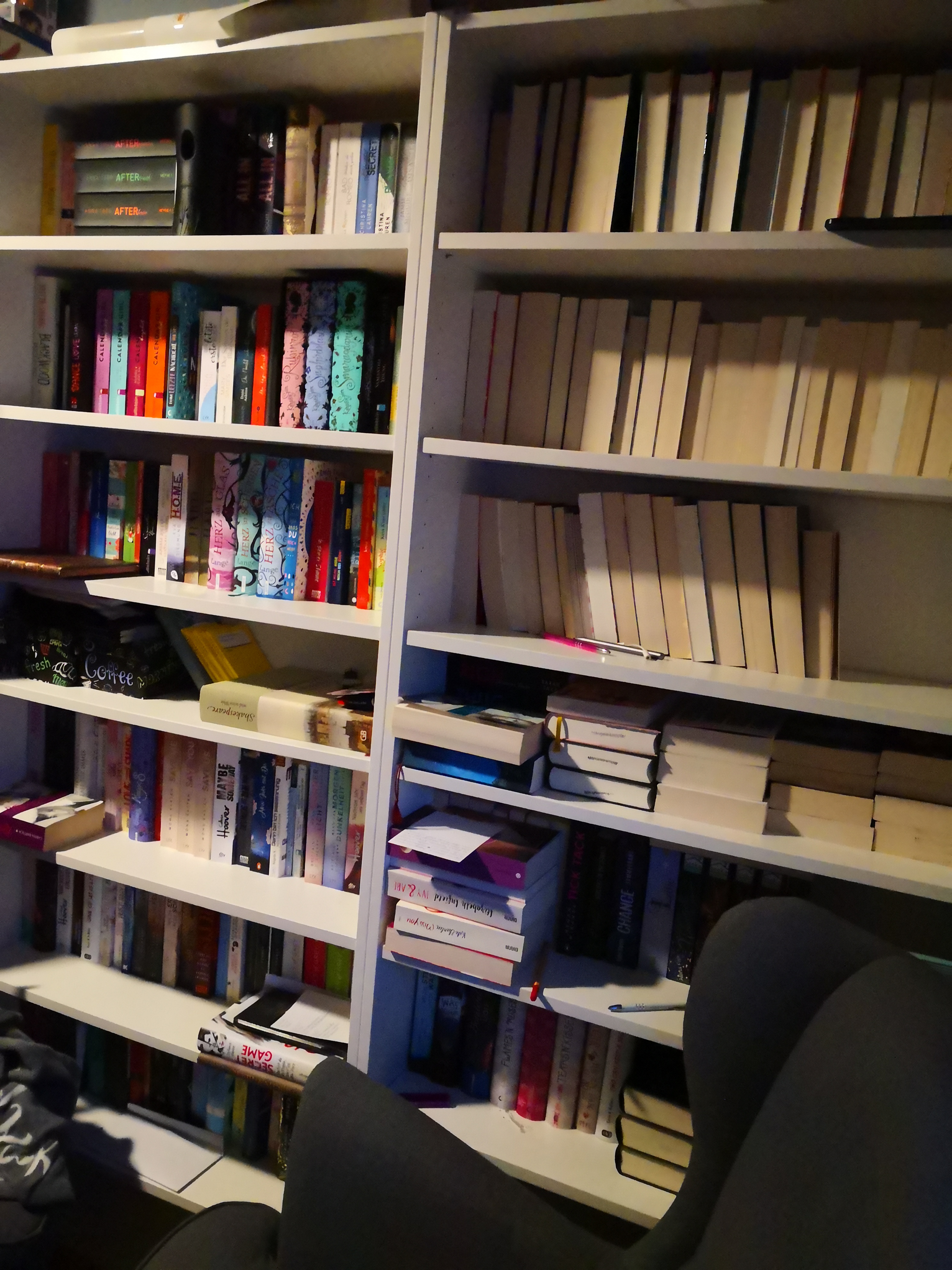 in dem schmaleren Fach sind Reziexemplare und Fortsetzungen, die ich noch nicht lesen kann. Unten drunter ist der Buddy-Read SuB und versteckt hinterm Sessel liegt da auch noch die House of Night Reihe.