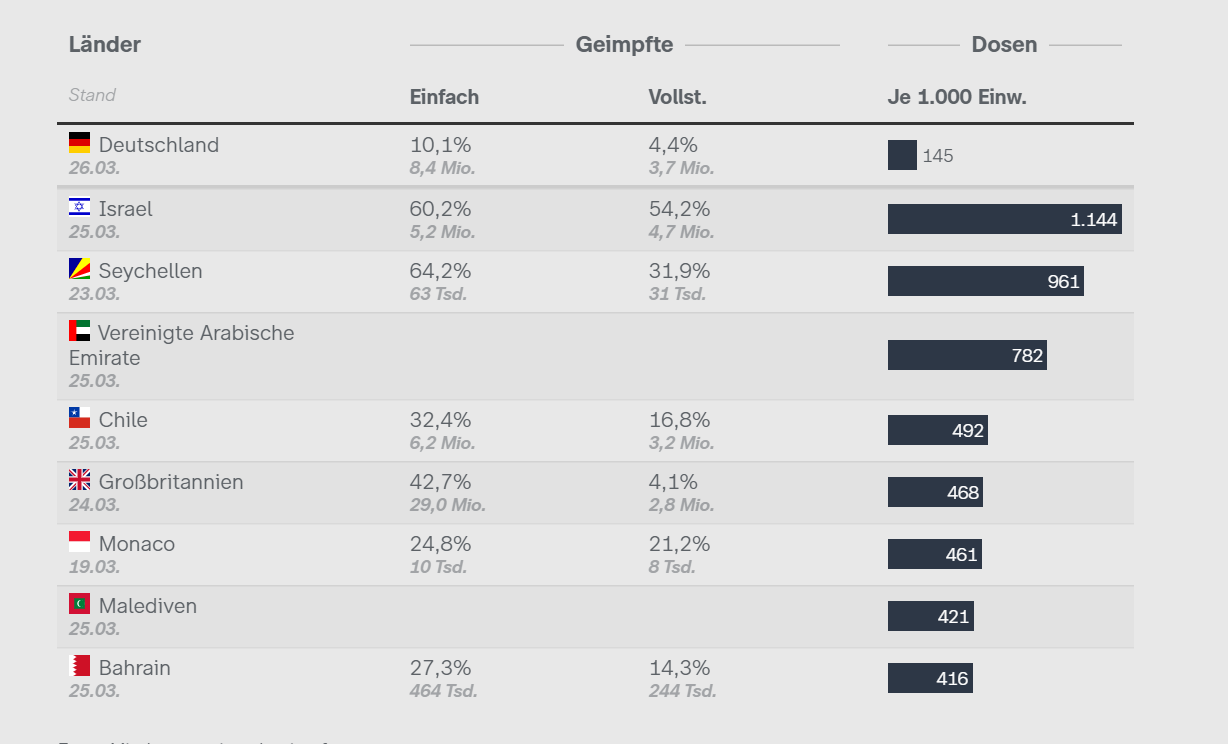 Anbei eine Aufstellung zu wie viel Prozent die jeweilige Bevölkerung bereits geimpft ist.