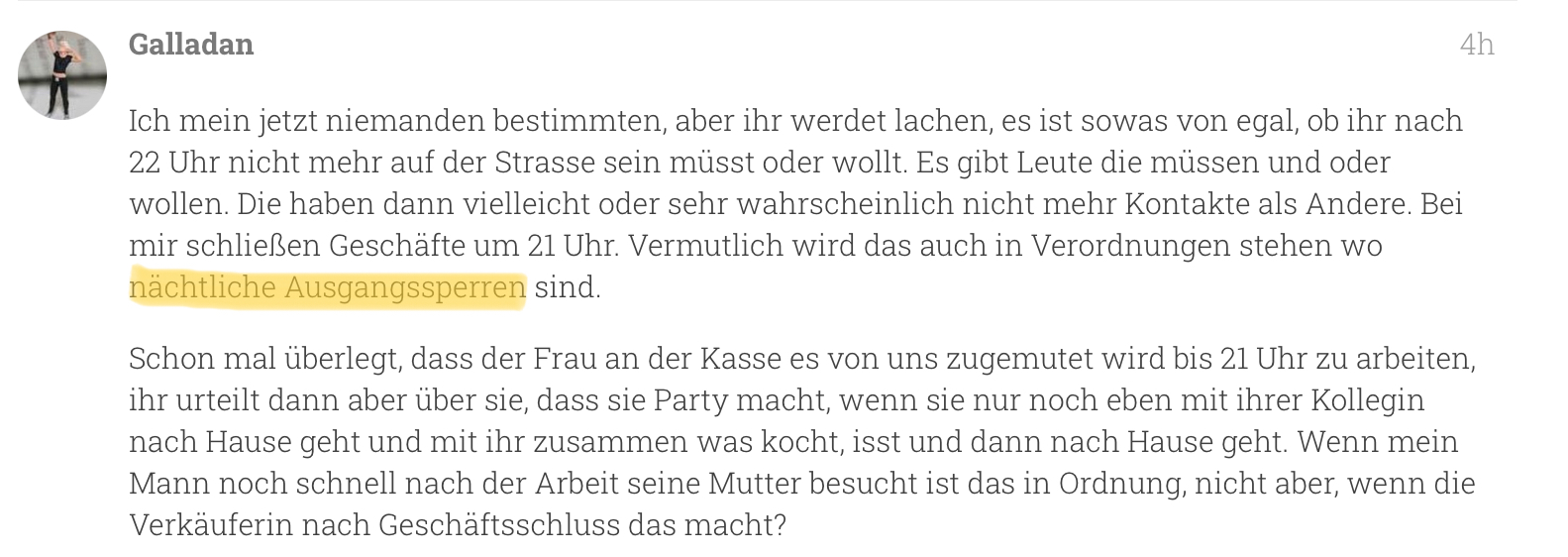 Ich hatte dich so verstanden, dass es bei dem Beispiel mit der Kassiererin, die bis Ladenschluss (= kurz vor Beginn einer potentiellen Ausgangssperre zu Nachtzeiten) arbeitet und danach noch jemanden besuchen möchte, um Ausgangssperren geht.