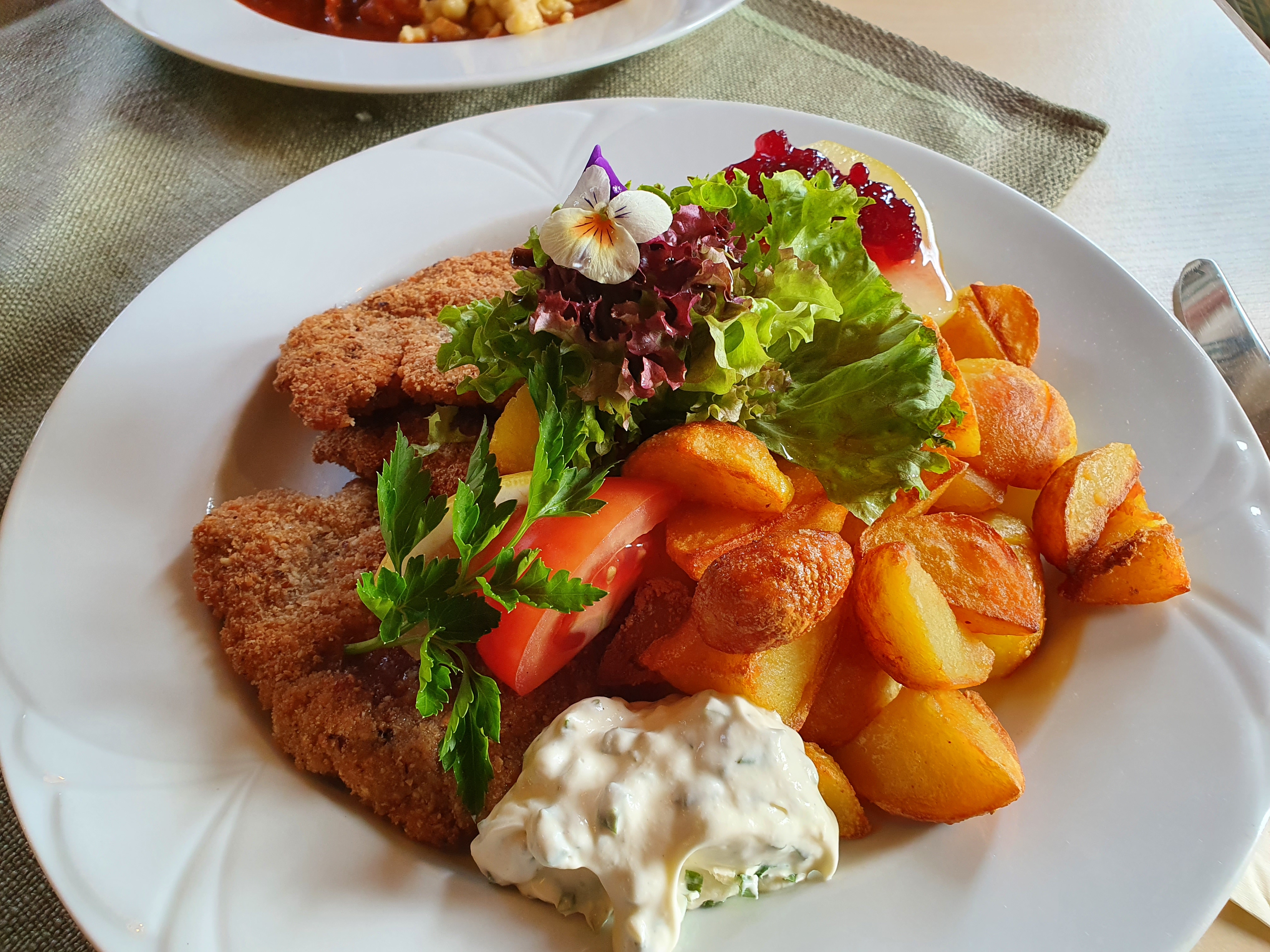Rehschnitzel aus heimischer Jagd, in Haselnusspanade mit Bratkartoffeln, Kräuter-Schmand und gemischtem Salat