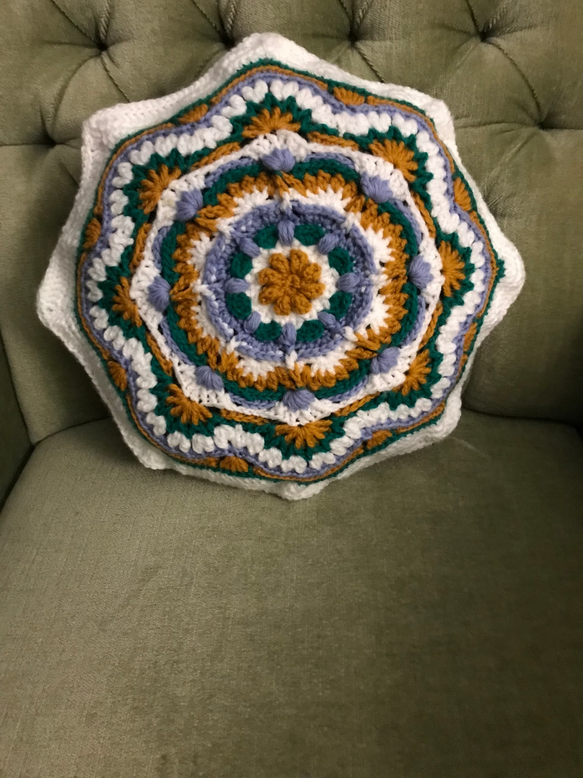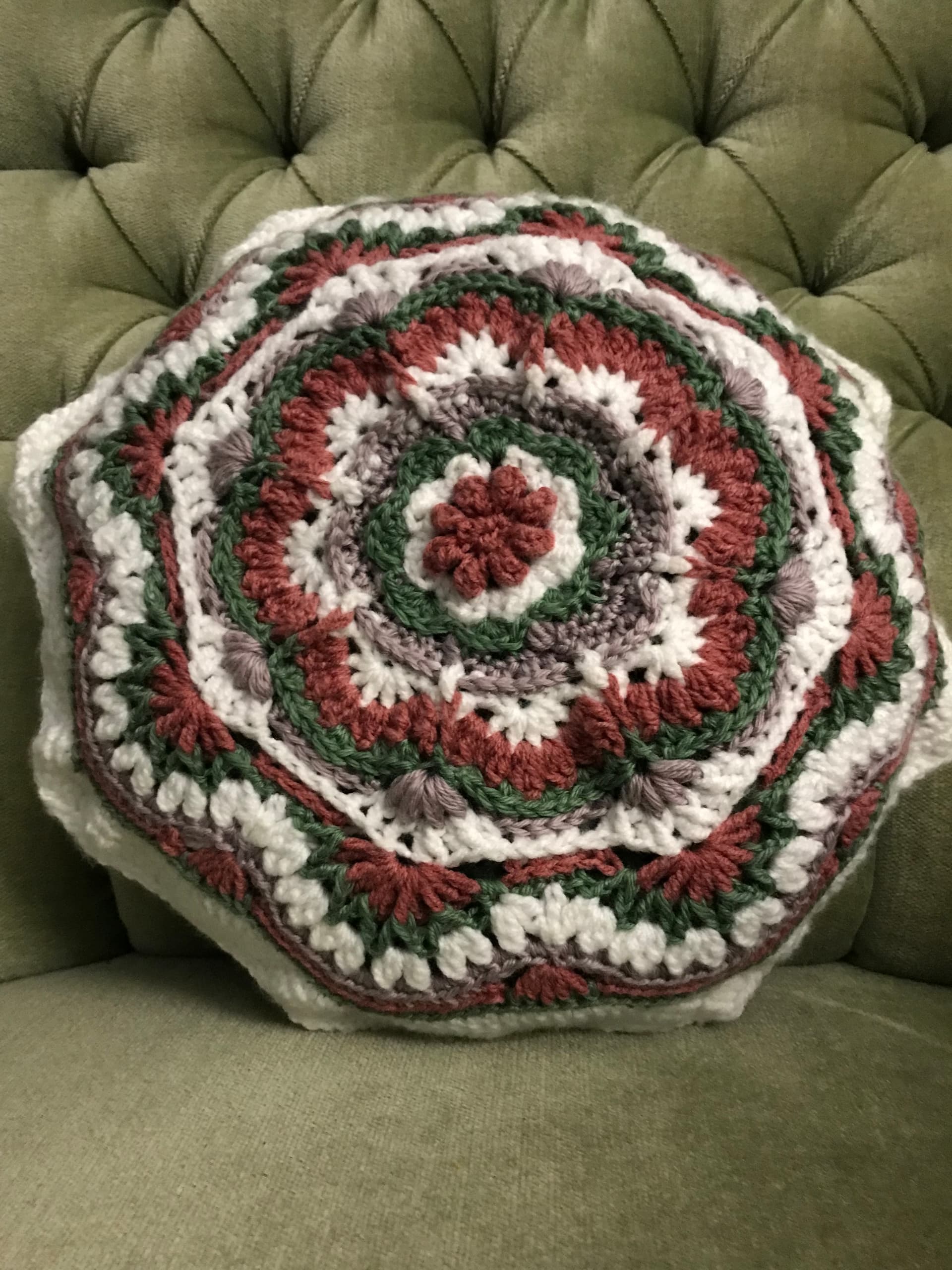 Ich habe inzwischen Kissenbezüge gehäkelt. Dieser ist heute fertig geworden. (Habe verschiedene Farben für Vorder- und Rückseite genommen)