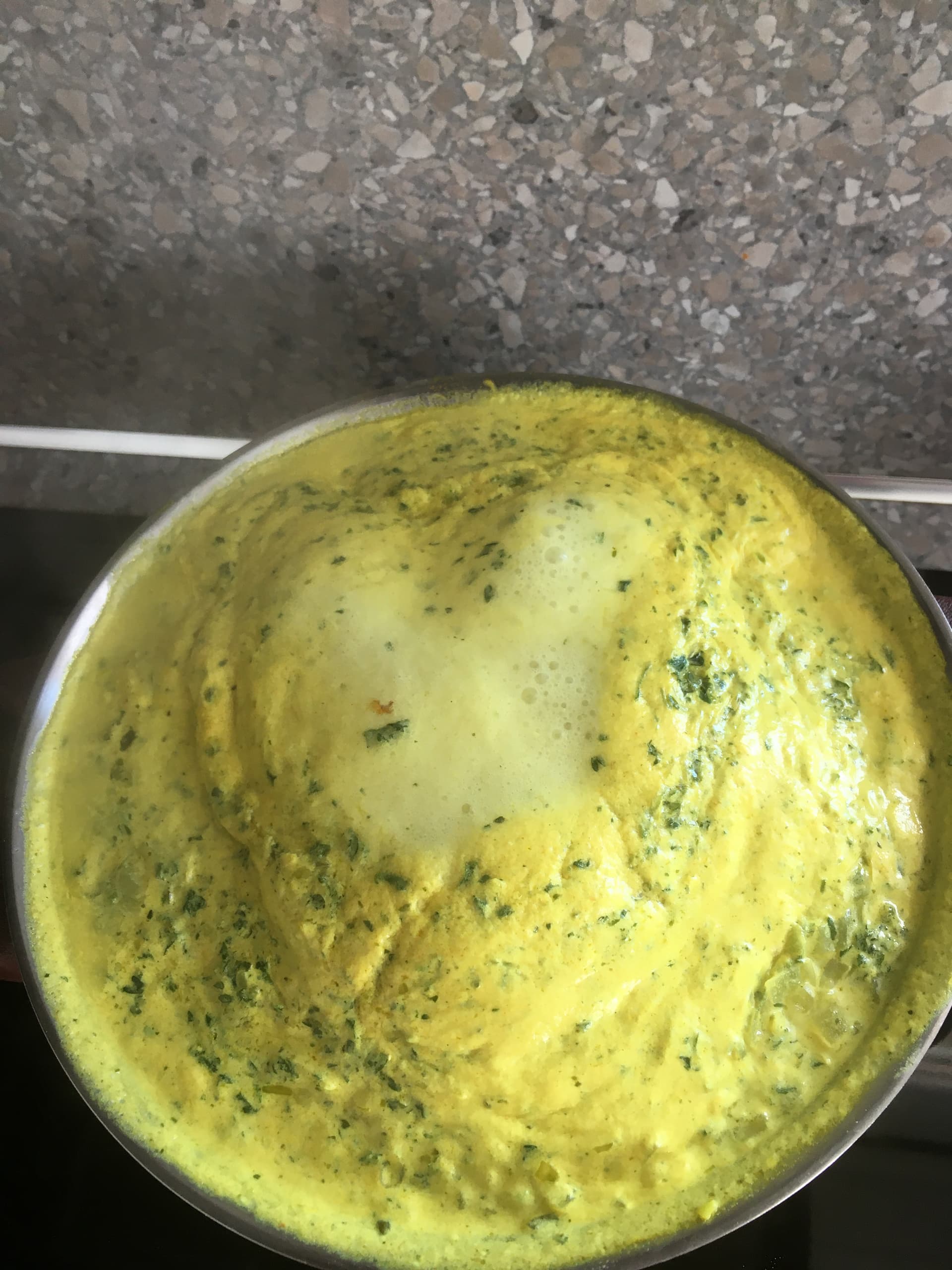Möhrensuppe mit reichlich frischem Kukuma und Petersilie und jede Menge Curry - kurz vorm Überkochen
