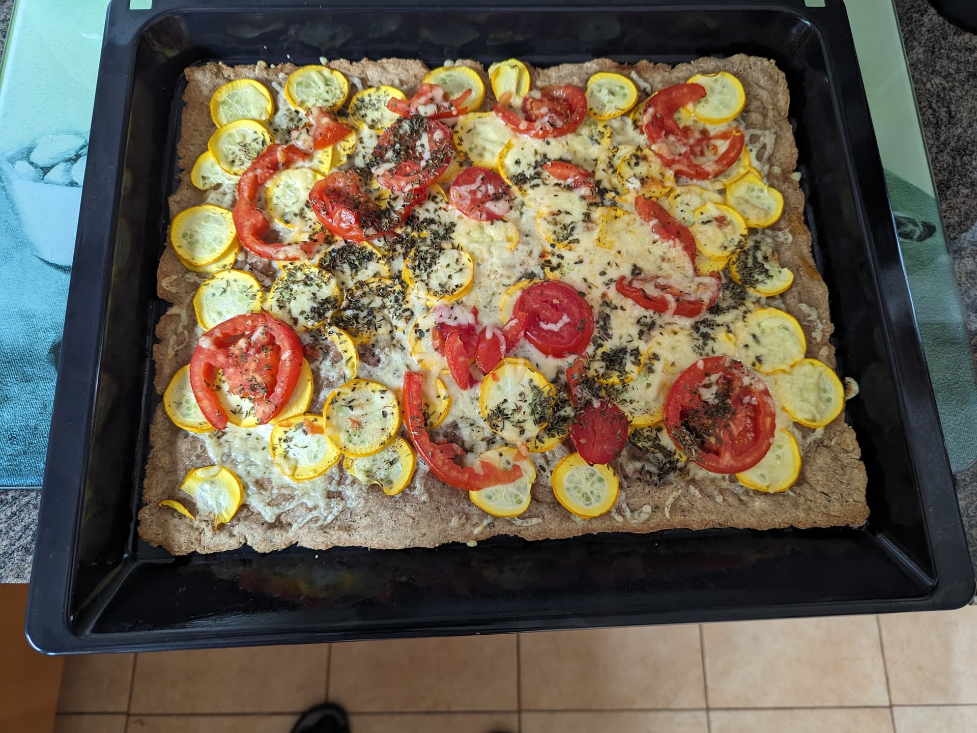 Dinkelvollkornmehl mit Eiern, Butter, etwas Salz und Kräuter, dann geriebenen Käse, Gemüse drauf und nochmal Käse.