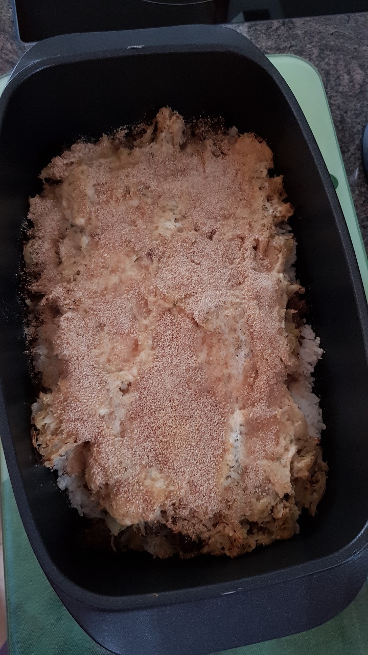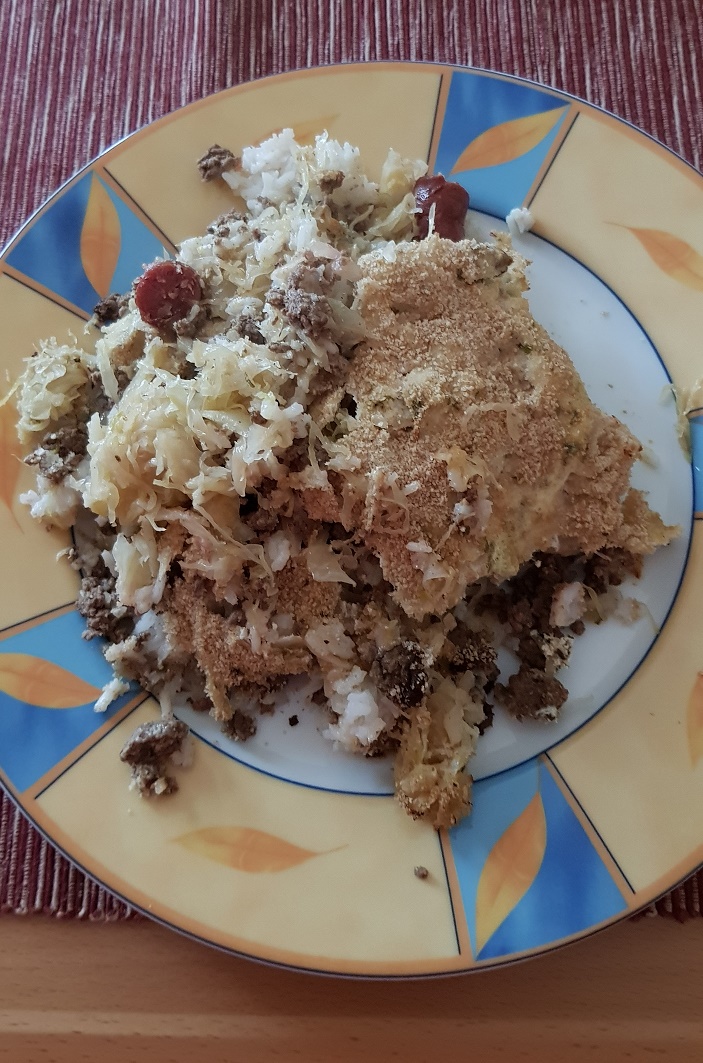 Ist ganz einfach, Reis kochen, Hackfleisch braten, mit Sauerkraut und Würstchen in eine Aufflaufform schichten. Die oberste Schicht war bei mir Sauerkraut. Dann Schmand oder saure Sahne mit Sahne mischen und oben drauf, zum Schluß Semmelbrösel.