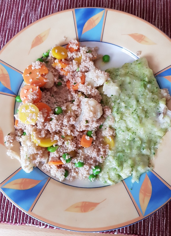 Dinkel-Couscous mit GemĂŒse und Fisch in Brokkolisauce