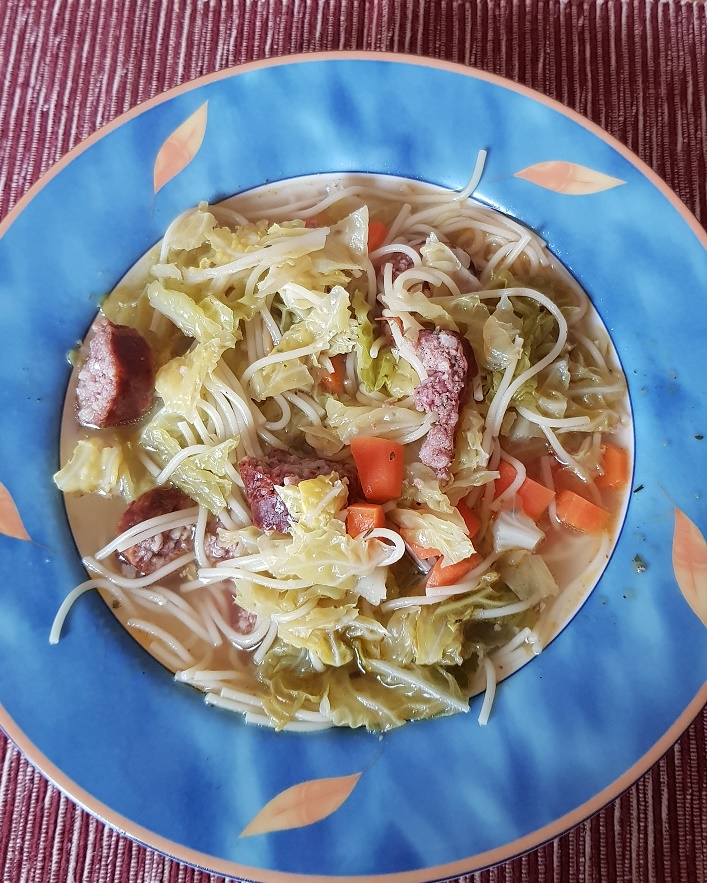 Wie immer - ohne Nudeln, aber mit Reis oder Kartoffeln wĂŒrde mir das auch schmecken (ohne Schweinswurst).