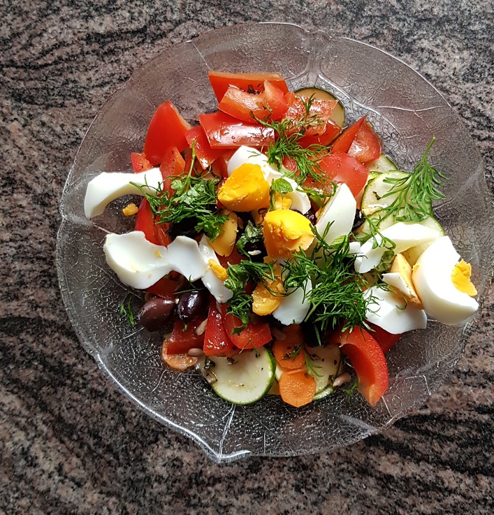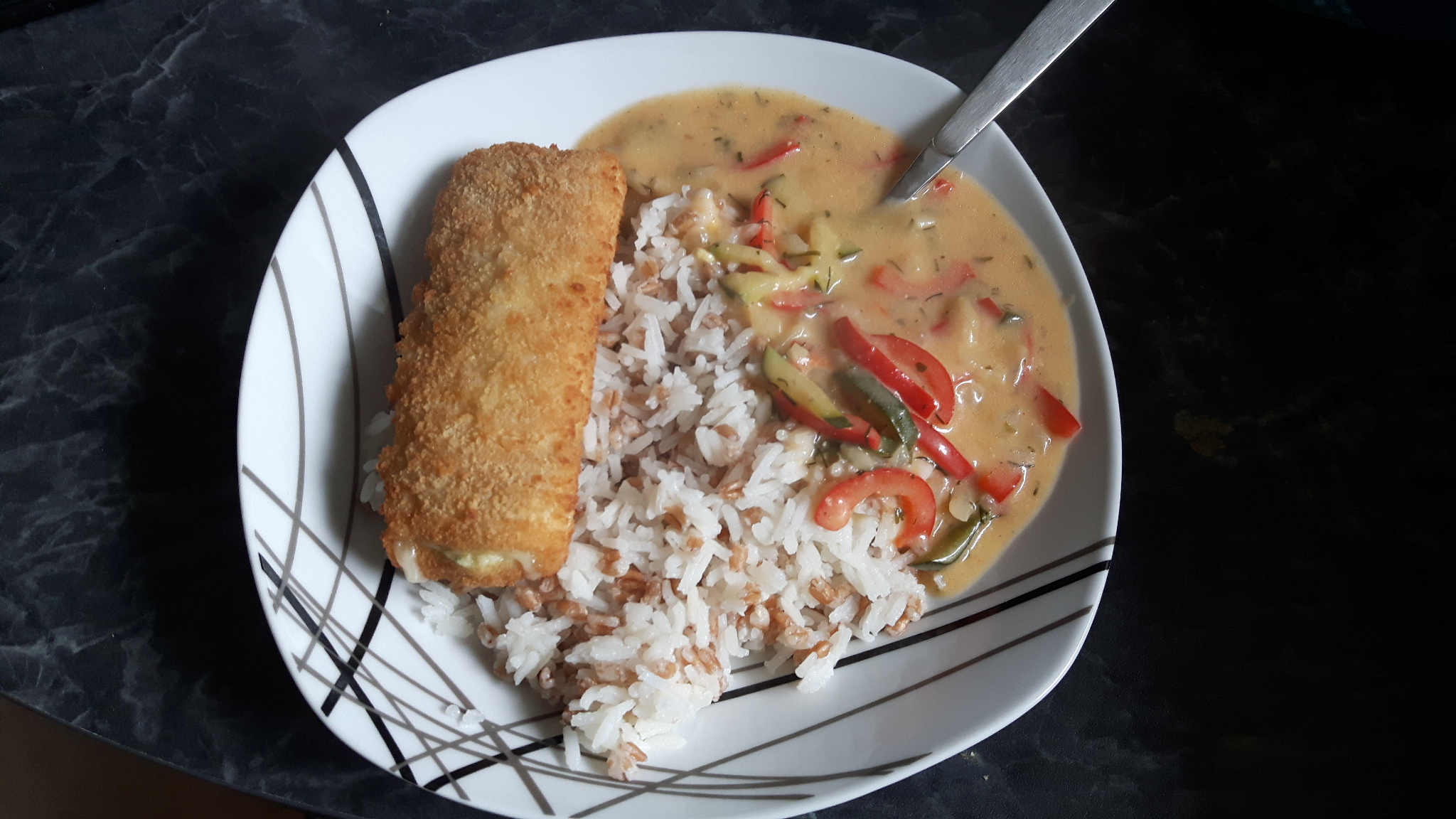 Heute gab es Fischfilet mit Reis-Dinkel und dazu eine Senf-Dillsoße mir Zucchini und Paprika.