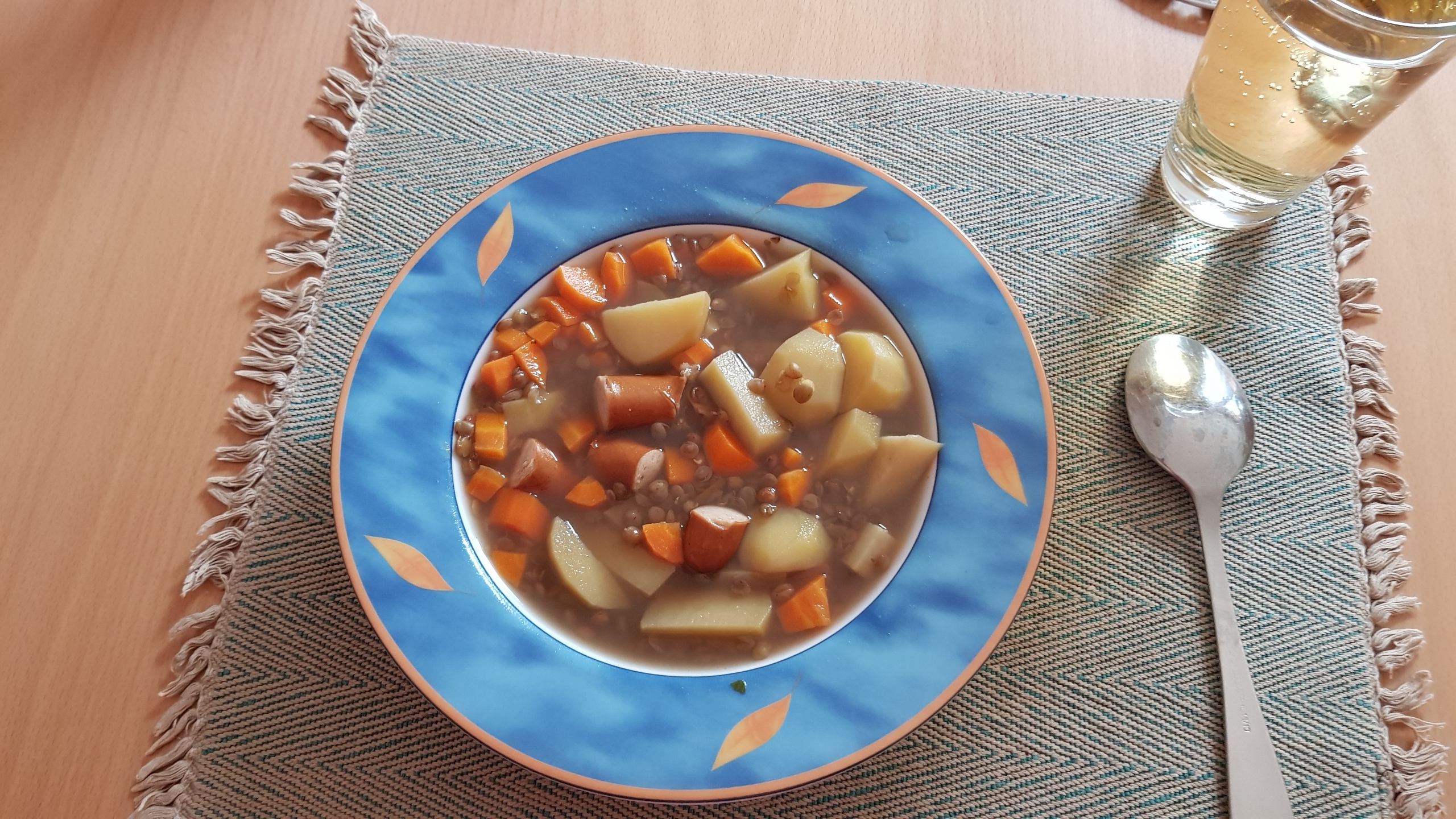 Ich musste gestern Hühnchen verarbeiten, also gab es zum Hühnerfrikassee und zum anderen Hühnchencurry, jeweils mit Reis. Aus Haut und Knochen habe ich eine Hühnerbrühe angesetzt, aus der dann eine leckere Gemüsesuppe wurde. Nun habe ich für die nächste Zeit genug, um nicht jeden Abend kochen zu müssen