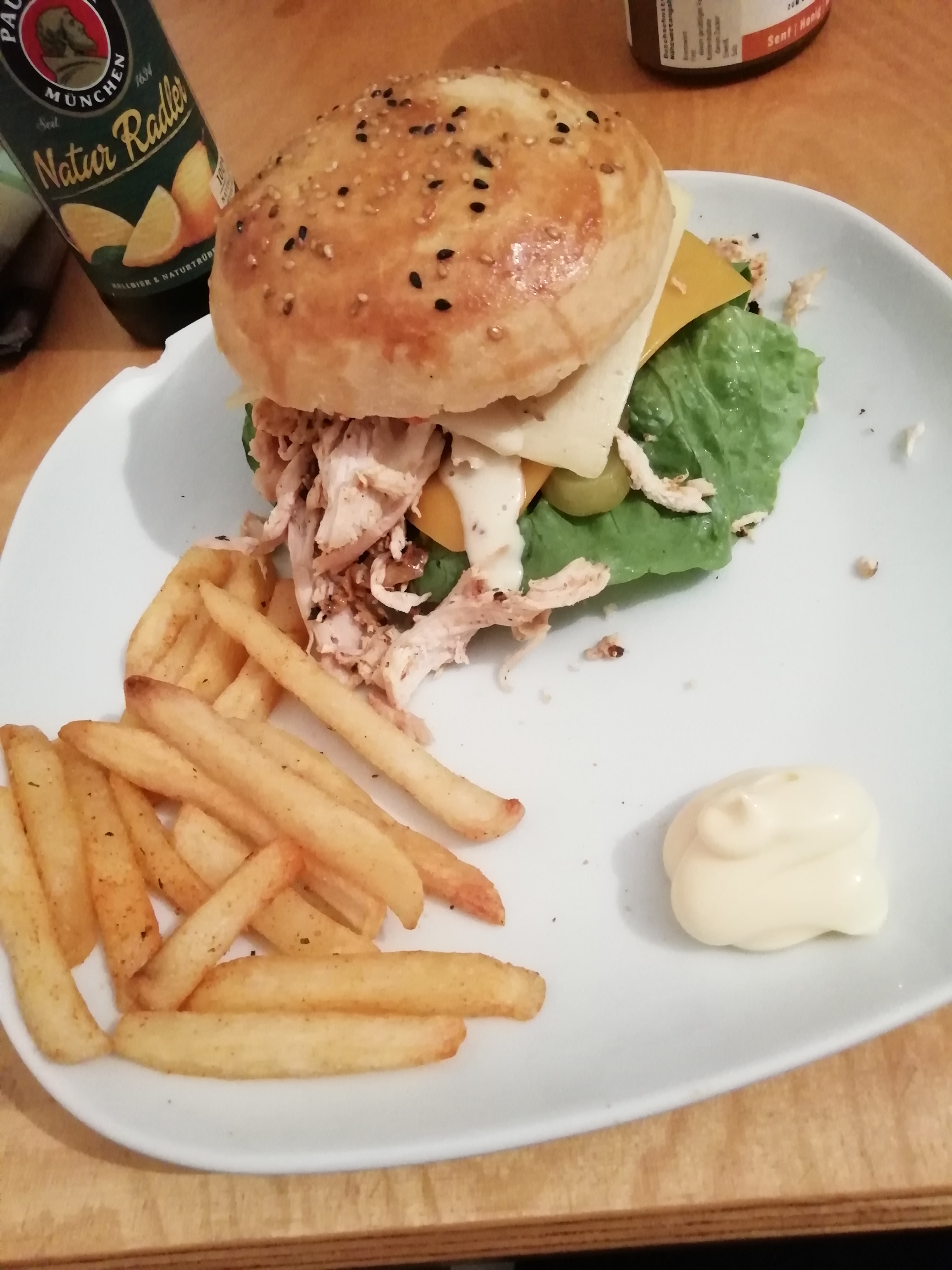 Wir machen heute Pulled Chicken Burger mit Pommes und selbstgemachten Buns