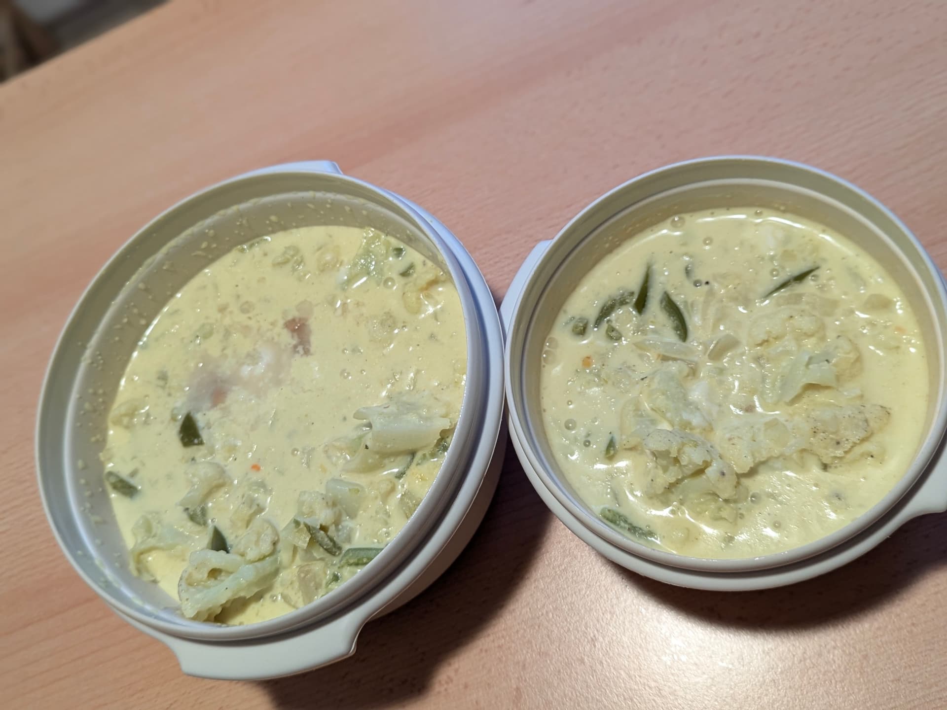 Aus dem Gemüse und der Mandelcreme habe ich eine extrem leckere Suppe gemacht