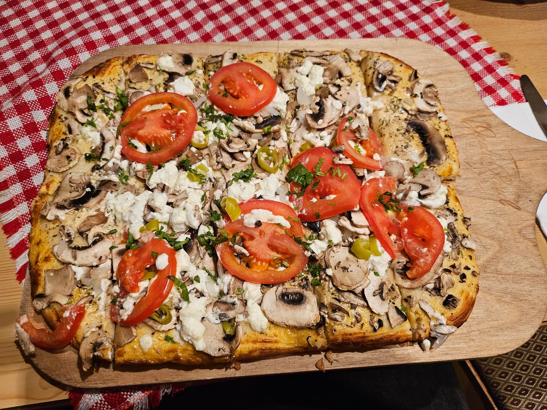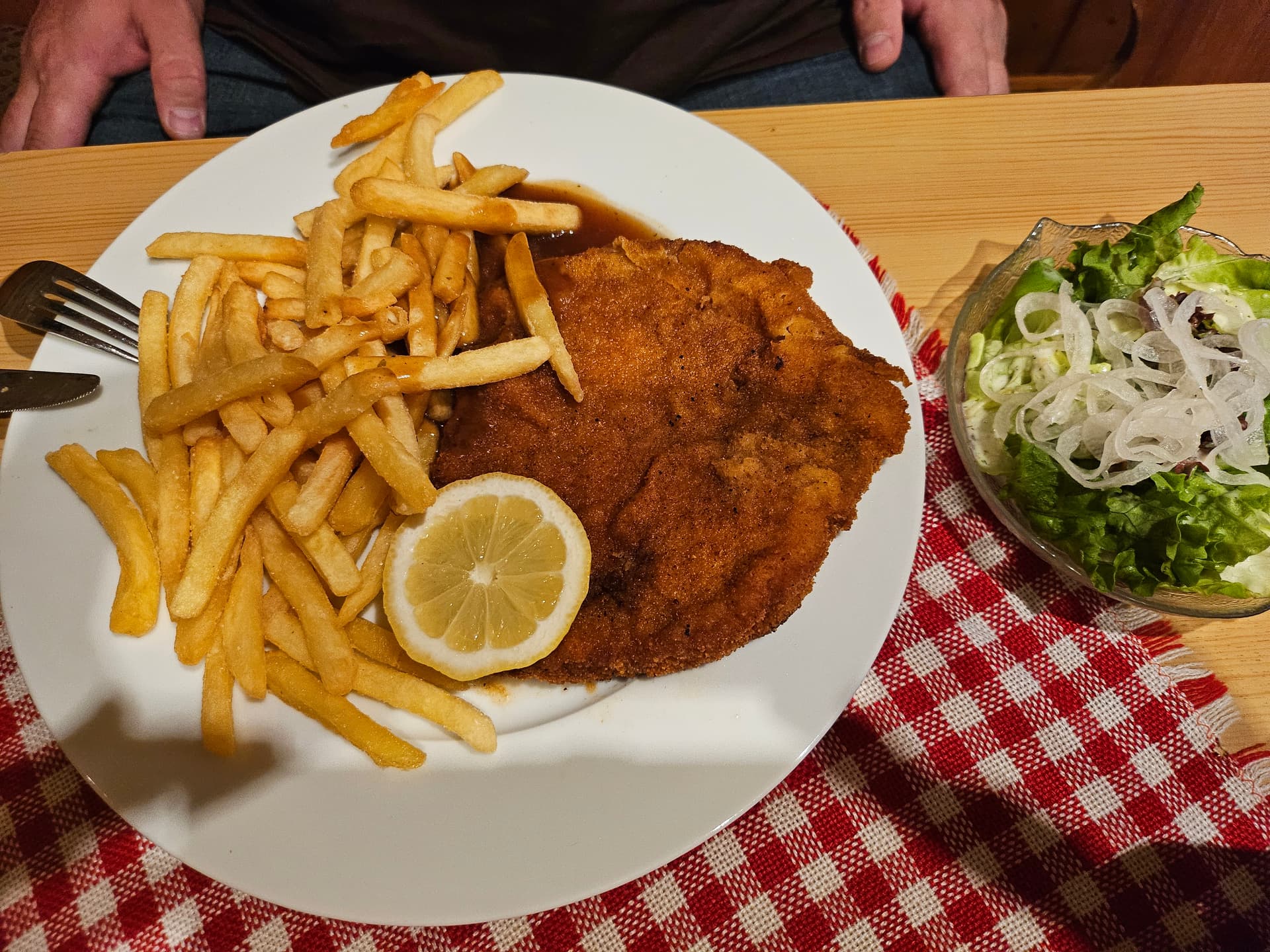 Wir haben heute geschlemmt, eine too good to go Tüte mit Leckereien aus Catering Leckeria Dornbirn, Schokoküchlein, Flammkuchen Stücke, würzige Waffel, Aufstrich mit getrockneten Tomaten, Kräuteraufstrich, Käse und Oliven. Dann 2 Tüten aus einem Bioladen mit Gemüse und Obst und tollen Pilzen, quasi ein mehrgängiges Menü für wenig Geld, so gut geht Essen gehen nicht. Bequem in der FeWo auf der Sitzecke in der Küche gefuttert.