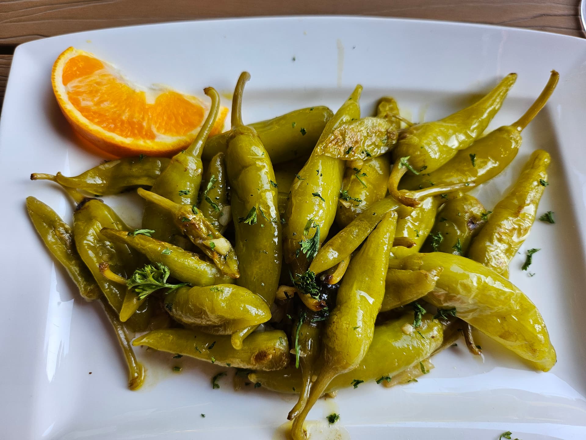 Heute ist es so heiß, da wollen wir gar nichts Warmes. Nur ein bisschen Brotzeit mit frischem Obst und Gemüse, eingelegte Oliven.