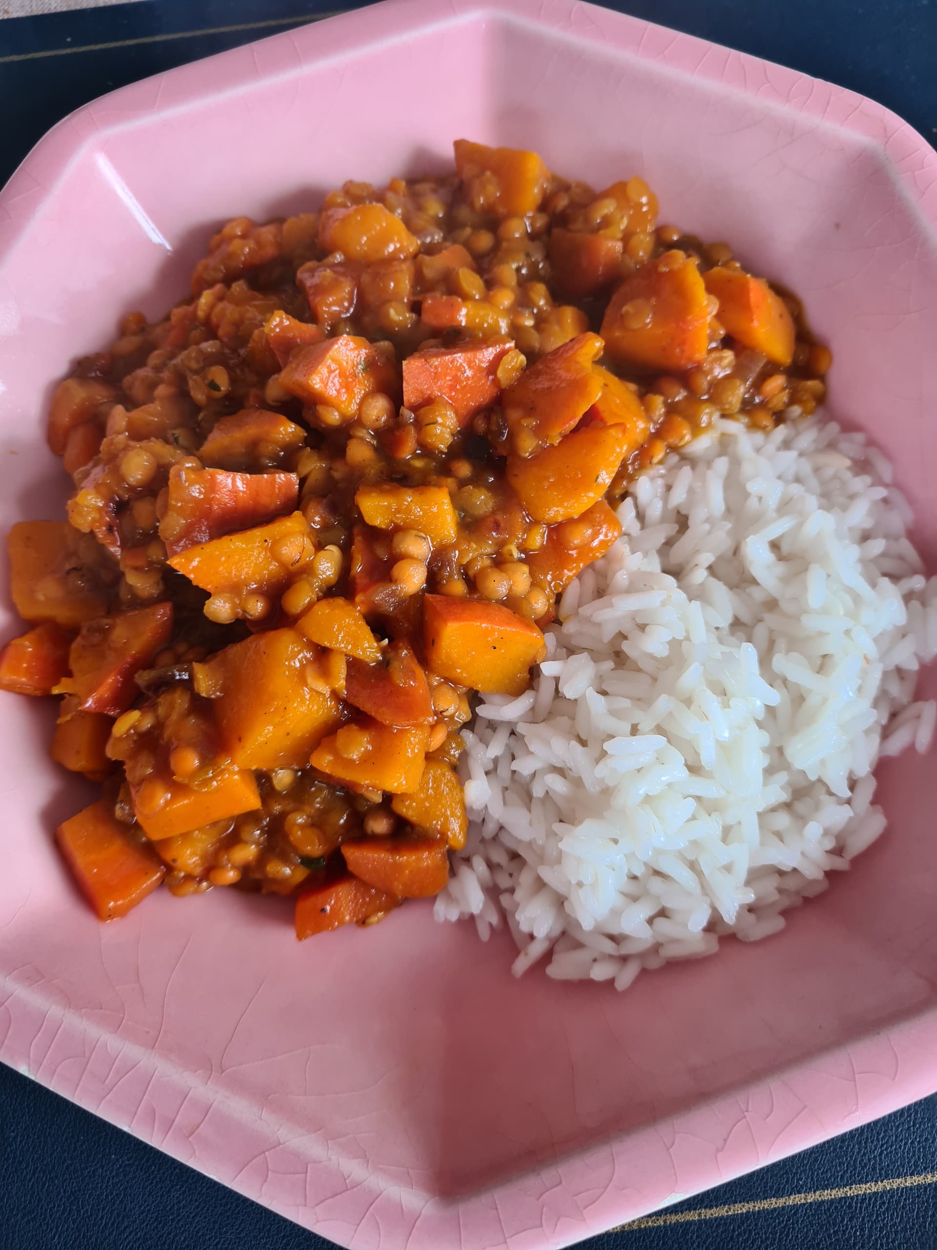 Veggie-Kind ist heute zuhause also gab es Kürbis-Linsen-Gemüse mit Reis.