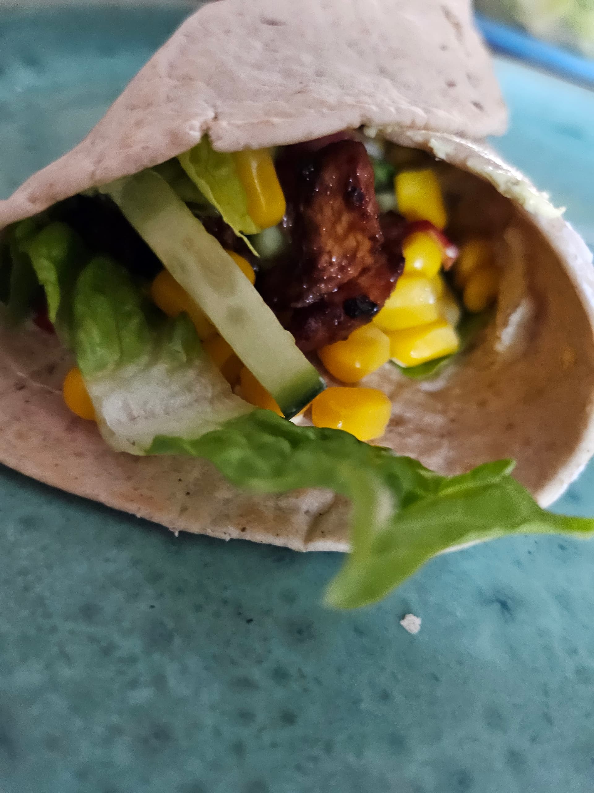 Hähnchenfleisch in dünne Streifen geschnitten, mariniert und kross gebraten. Ich esse ja kein Schweinefleisch.