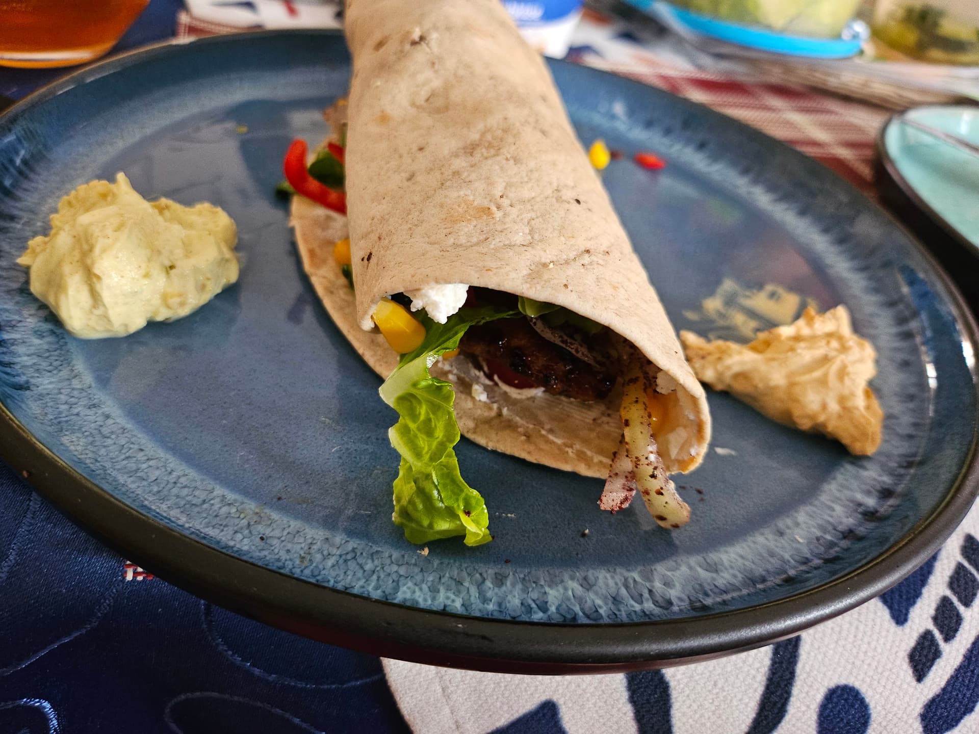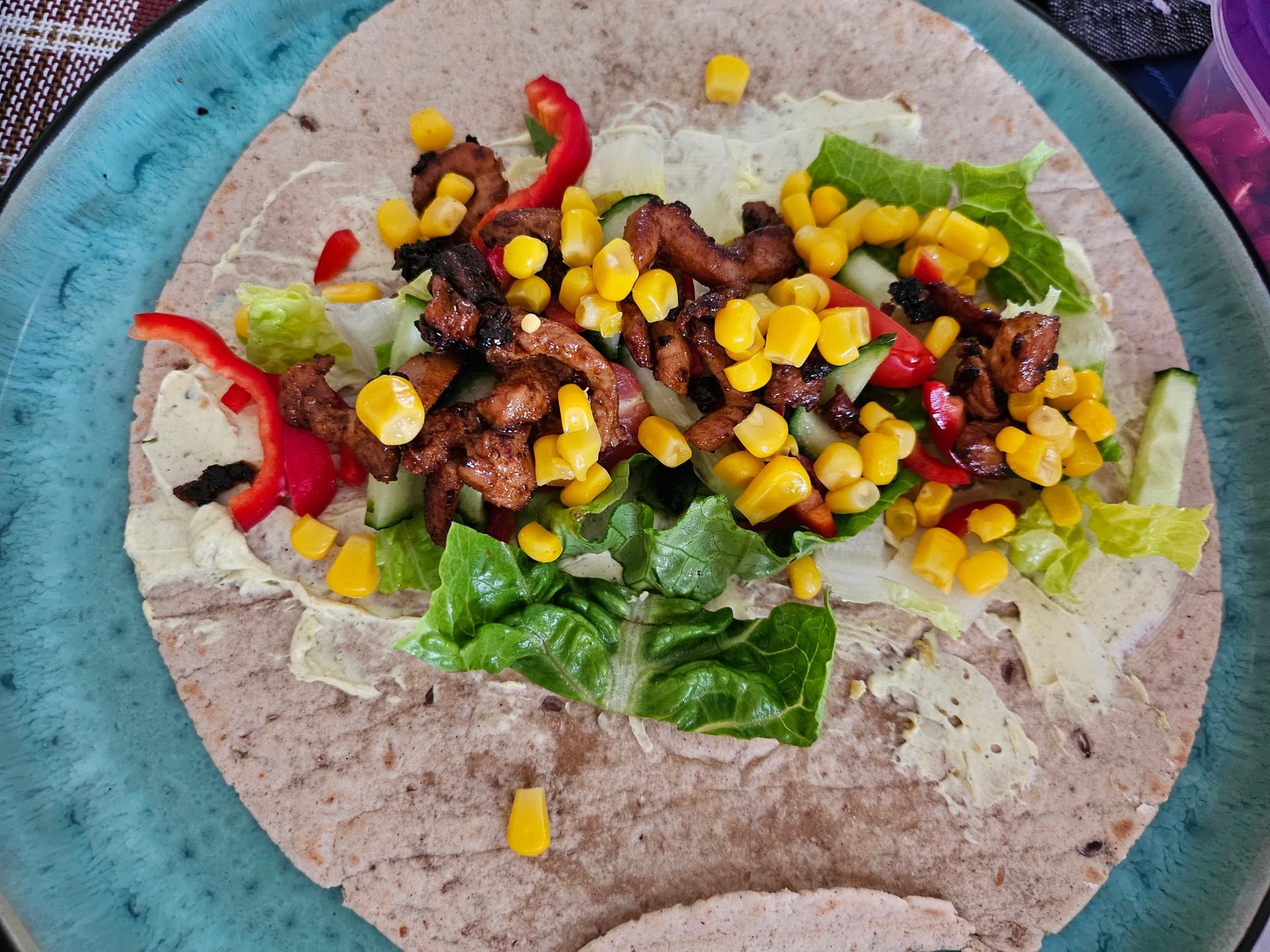 Wir grillen, dazu Salat und den restlichen Nudelsalat von heute Mittag.
