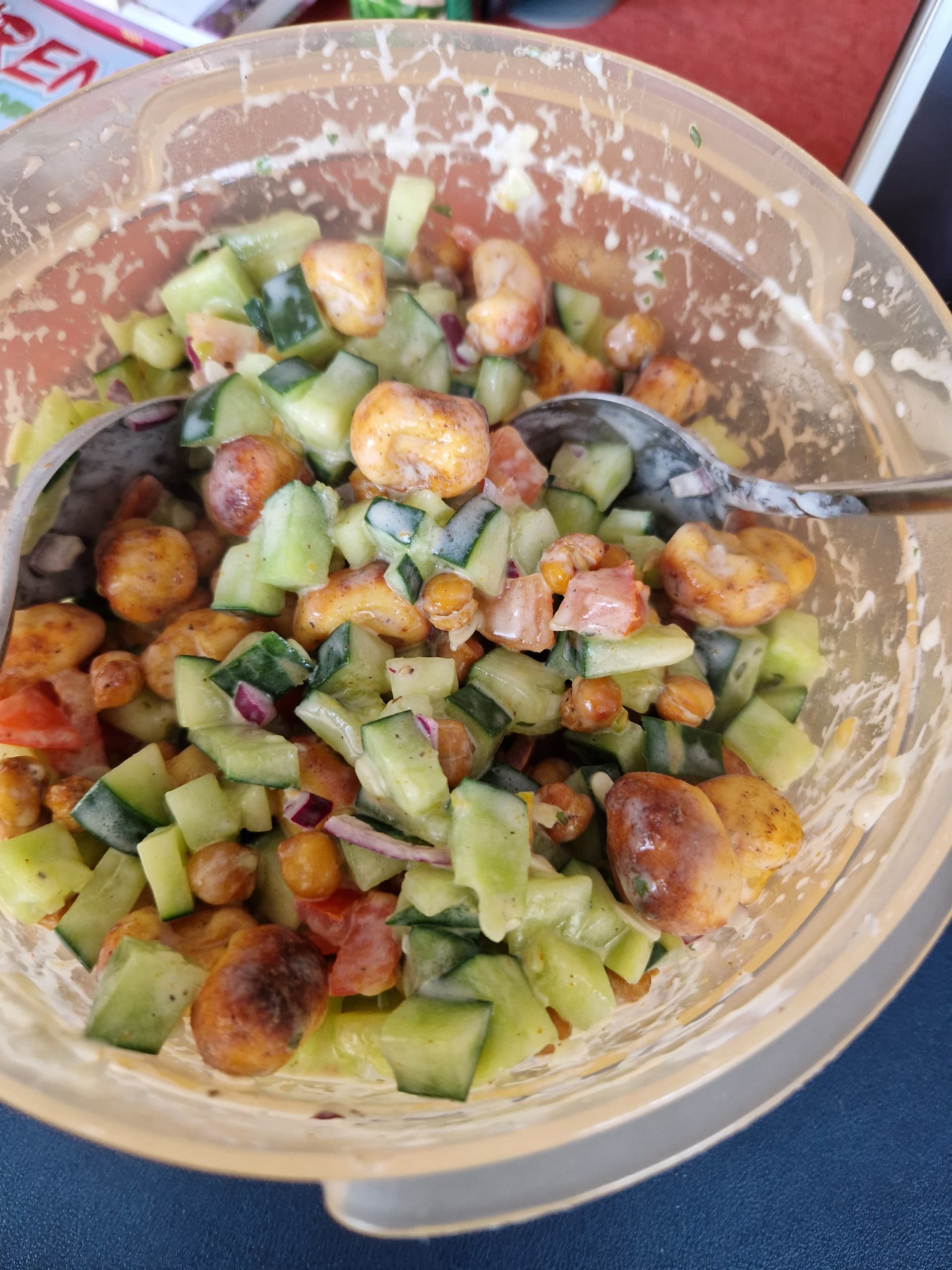 Dafür sind massig Zwiebeln drin (sorry, Squirrel!), halbierte Cocktailtomaten, Cornichons gewürfelt und ganz viel frische, gehackte Petersilie. Und natürlich Geflügelmortadella in schmale Streifen geschnitten.