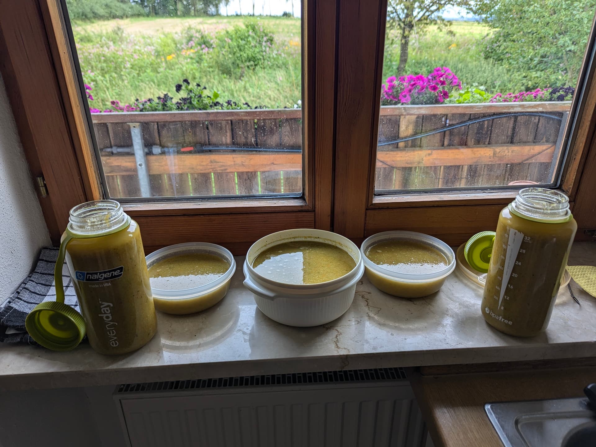 Heute gab es Bohnensuppe aus frischen Bohnen aus dem Garten, wahlweise dazu Wiener oder Rauchfleisch.