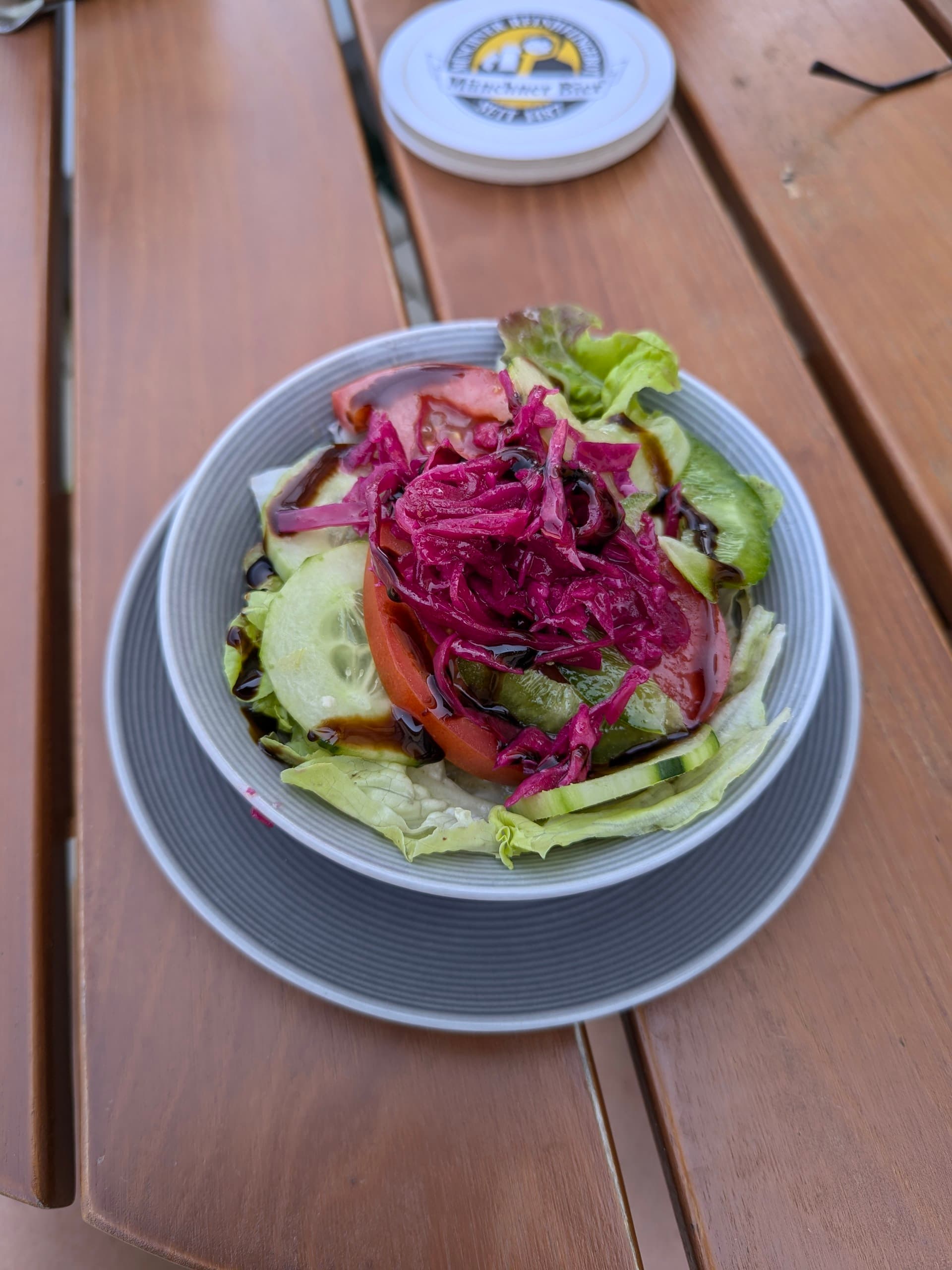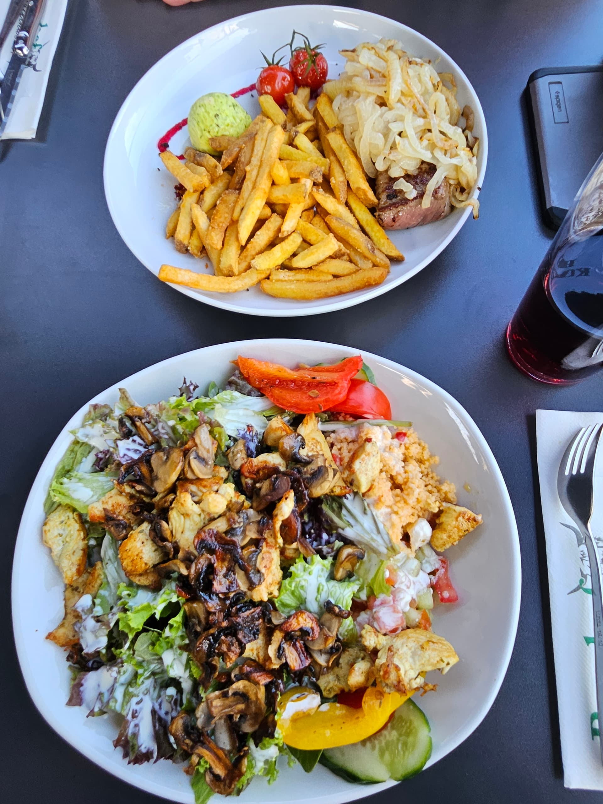 Dann Rumpsteak für den besten Ehemann von allen und großer Salat mit Pilzen und Hähnchenstreifen für mich.