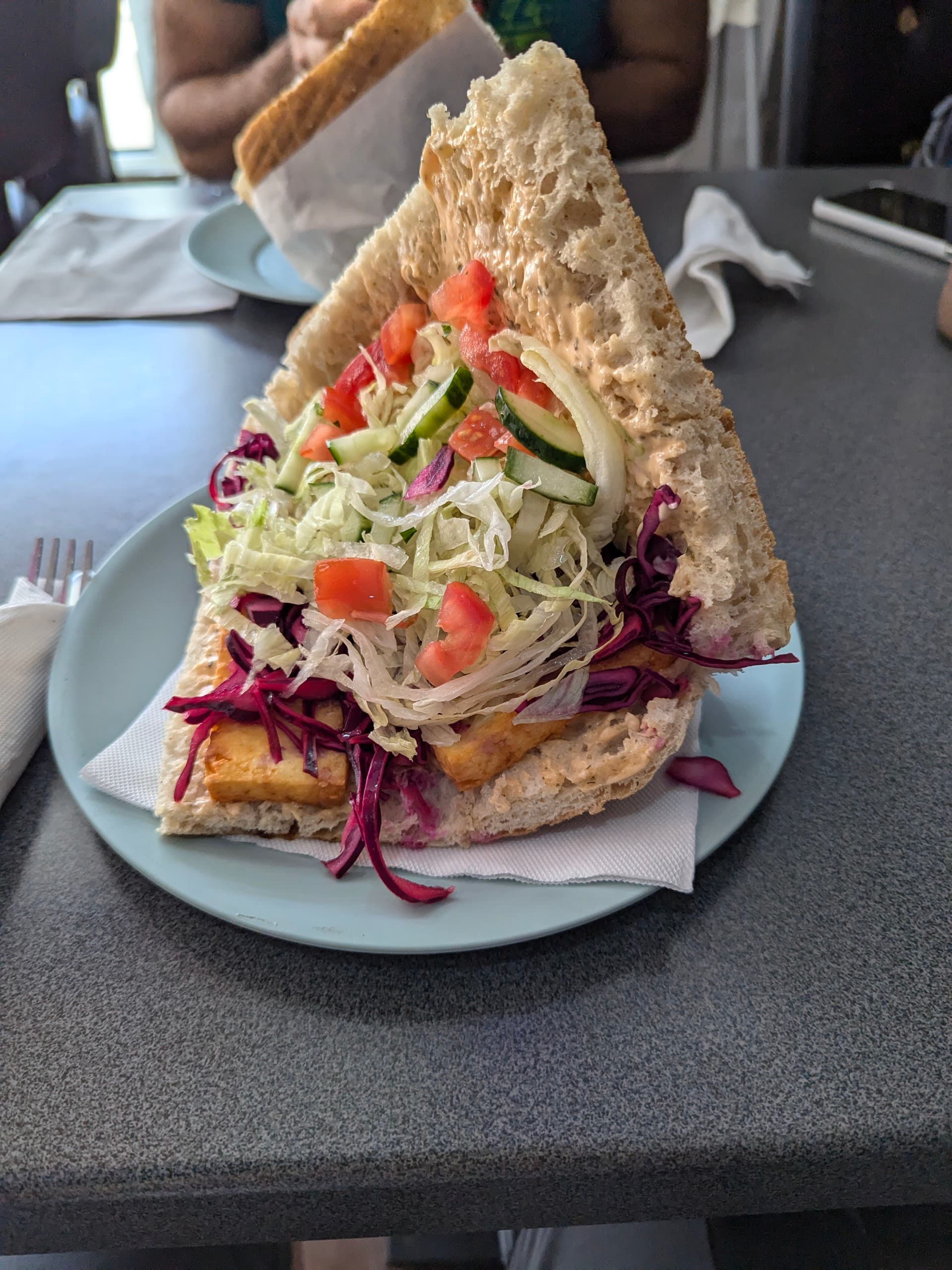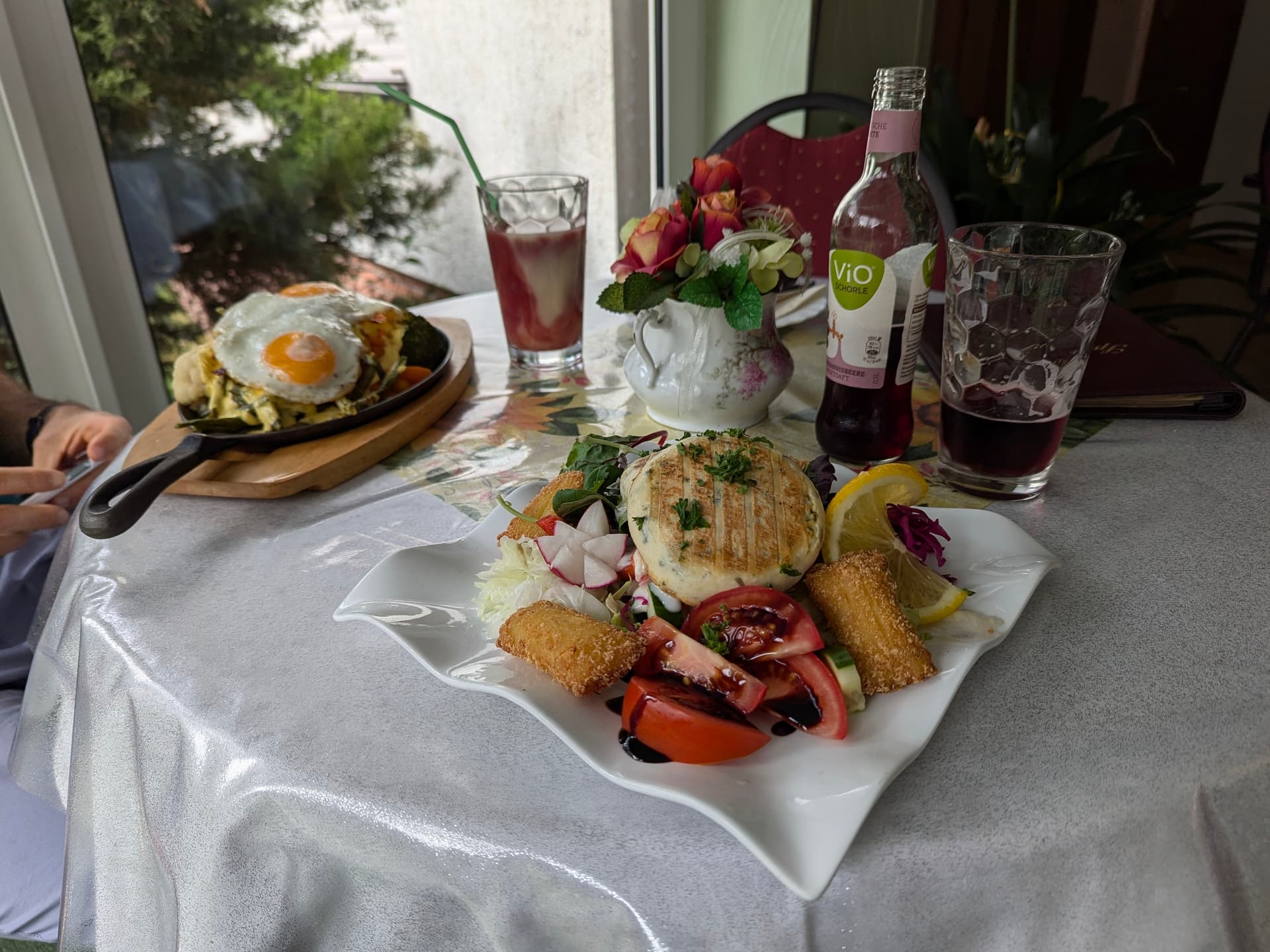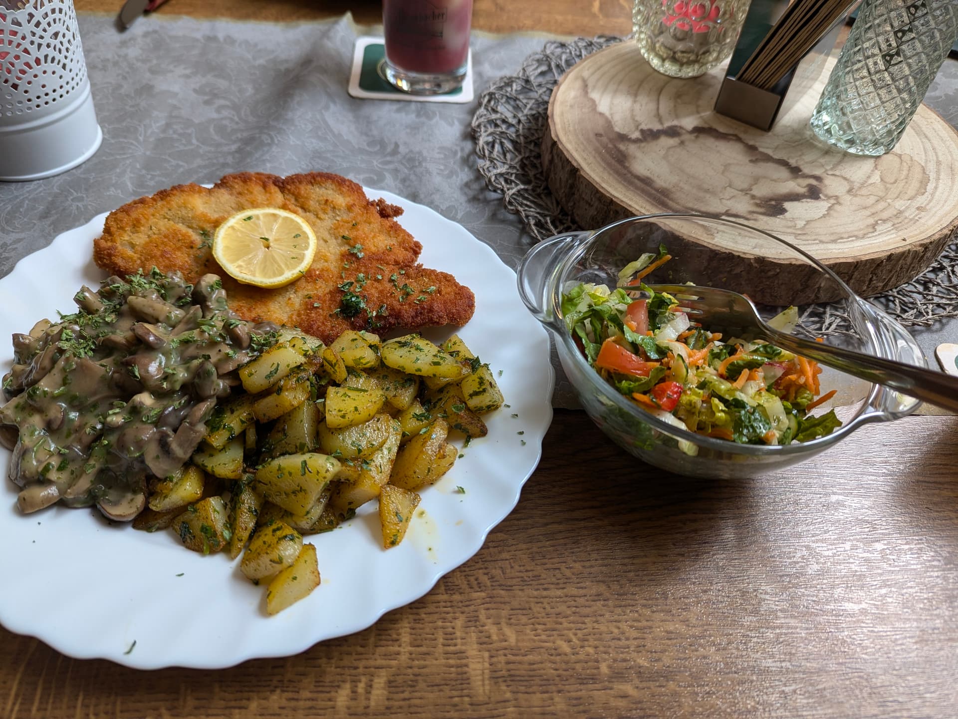Ich hatte einen bunten Salat mit Käsetalern und Frischkäsetaschen, mein Mann buntes Gemüse mit Spiegeleiern. Das ist ein Eiscafe gewesen, die auch Mittagsessen anbieten. Außerdem habe ich mir