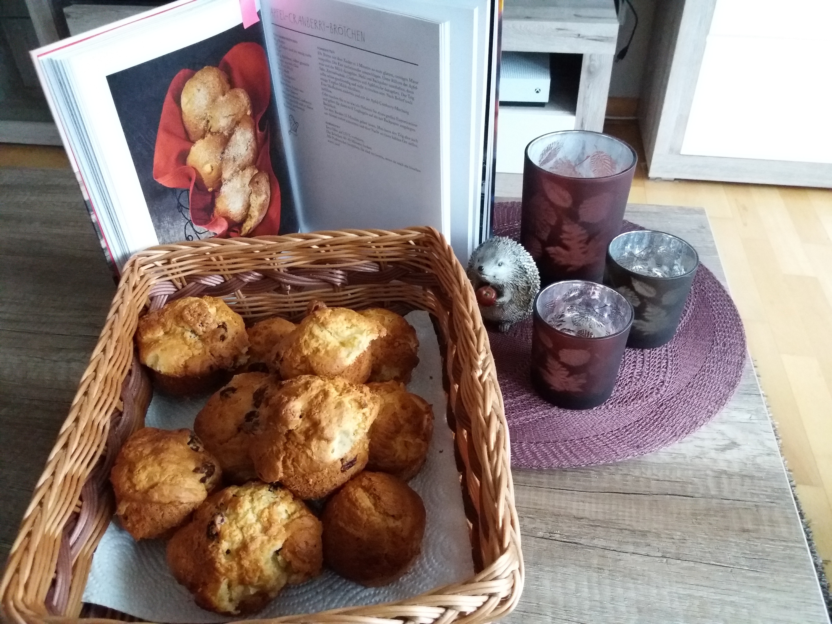Vorhin dann aus dem gleichen Buch die Apfel-Cranberry-Brötchen, was eigentlich eher Kuchen ist, gebacken. Die sind mega lecker und schön fluffig.
