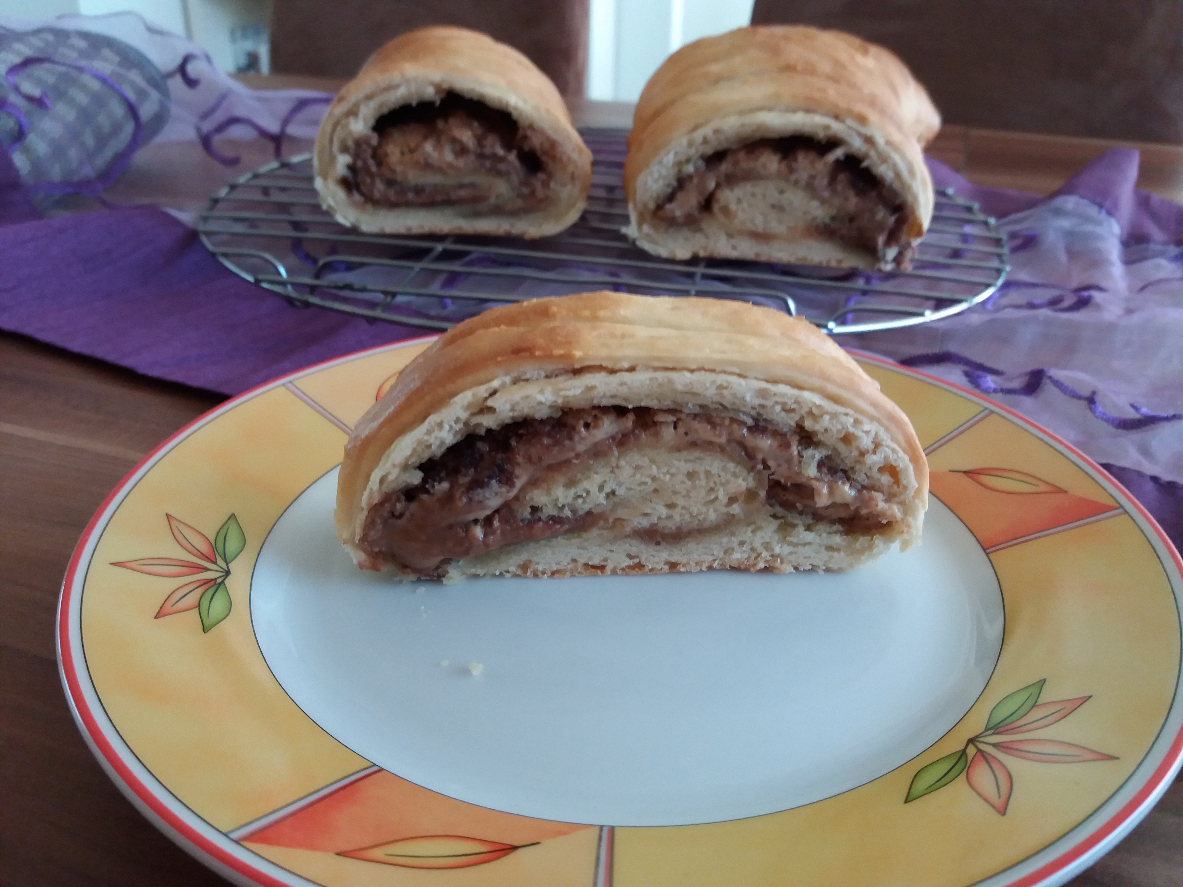 Vor einigen Tagen habe ich einen selbstgemachten Haselnuss-Schoko-Aufstrich gemacht, was viel zu viel war, dann kam mir vorgestern die Idee, ihn zu verbacken. Also habe ich gestern die Nussstrudel von backen mit Christina gebacken und ihn mit etwas Nutella vermischt da drin verarbeitet. Hat super geschmeckt
