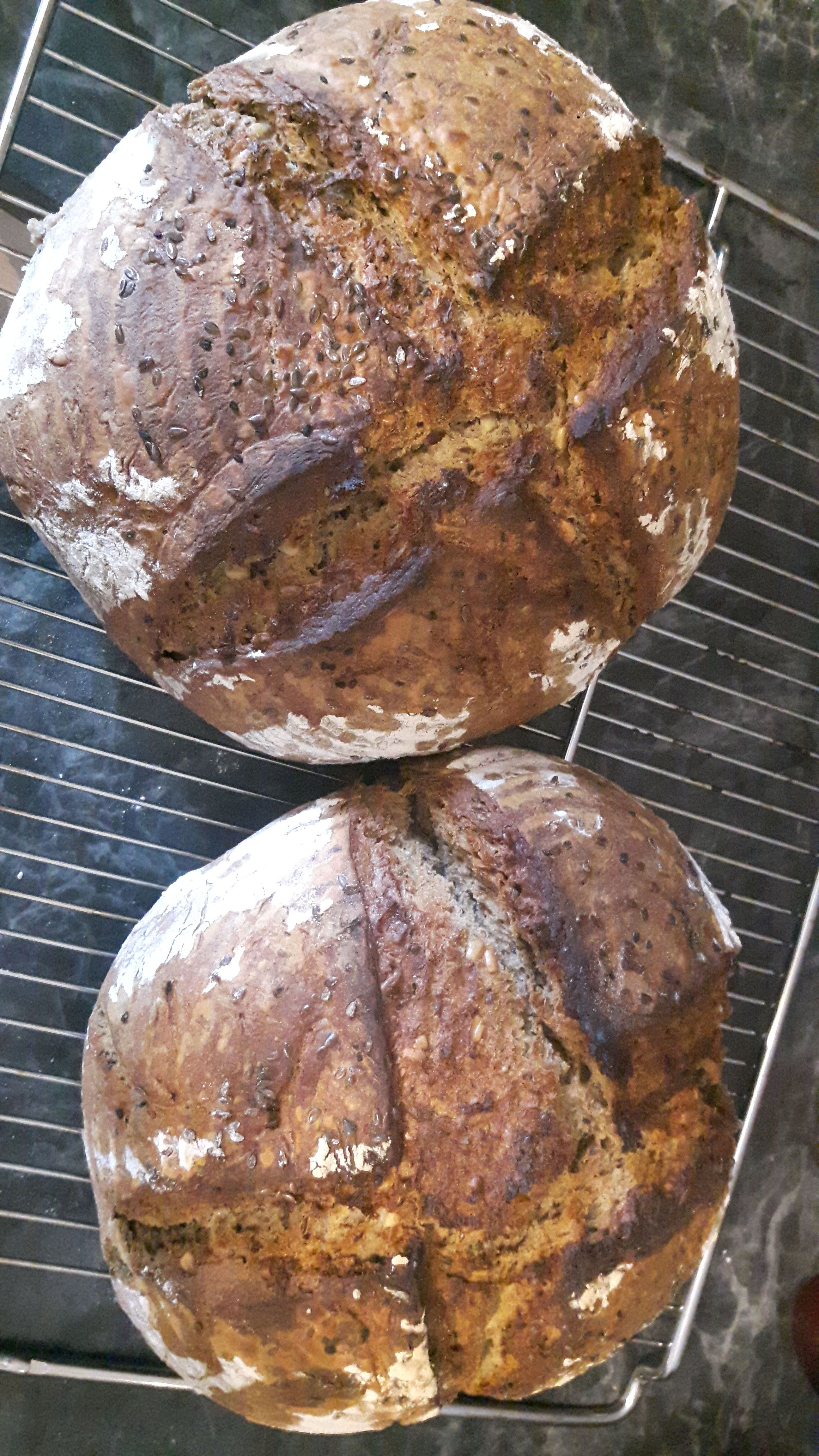 Die Über-Nacht-Frühstückssemmeln waren sehr lecker, das Körner-& Saatenbrot haben wir noch nicht probiert. Bisschen dunkel oben, aber sieht lecker aus und riecht gut.