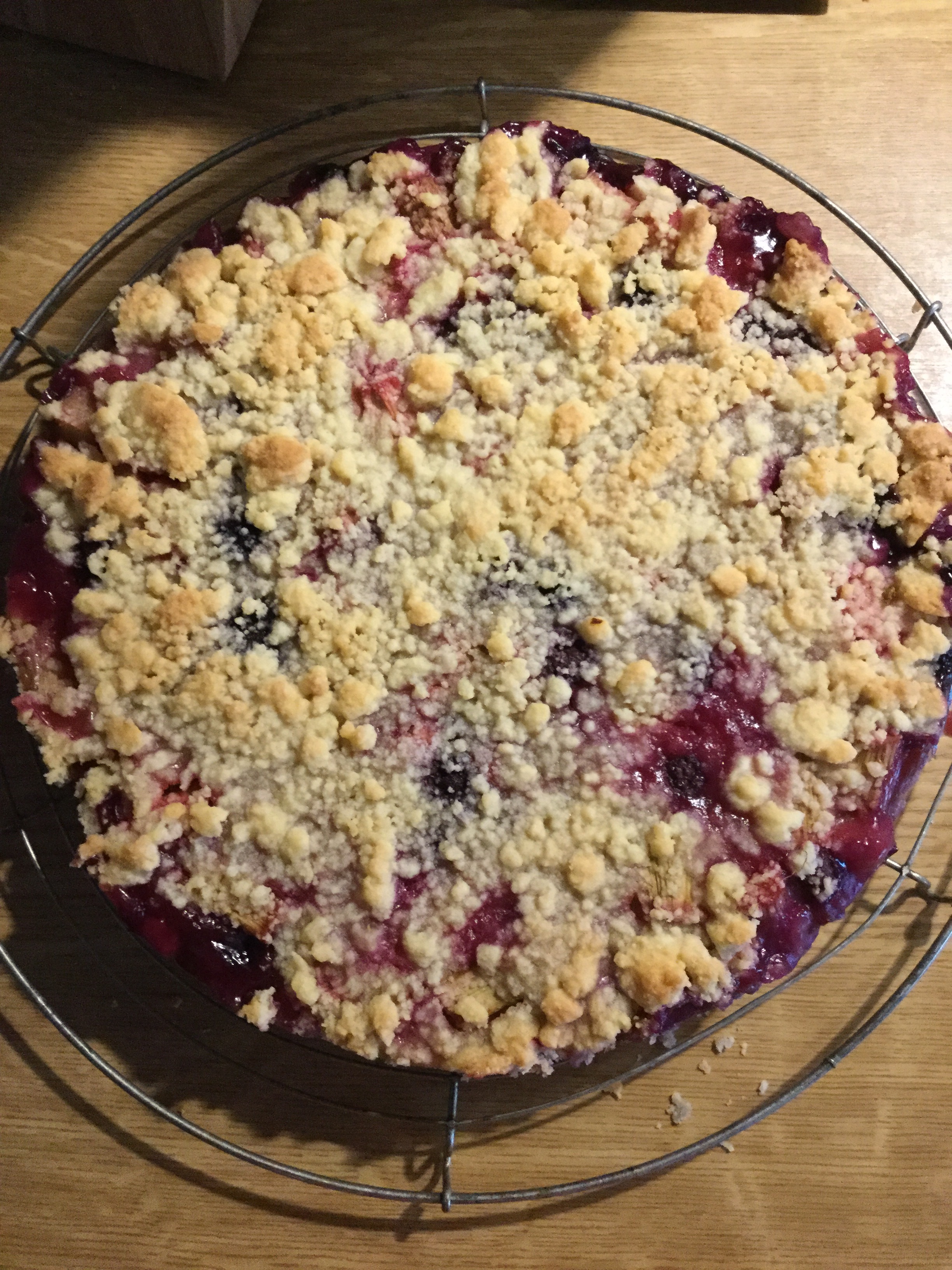 Ich habe den letzten Rhabarber geerntet. Er reichte nicht ganz für den Kuchen. Da habe ich noch ein paar Heidelbeeren dazu gepackt.