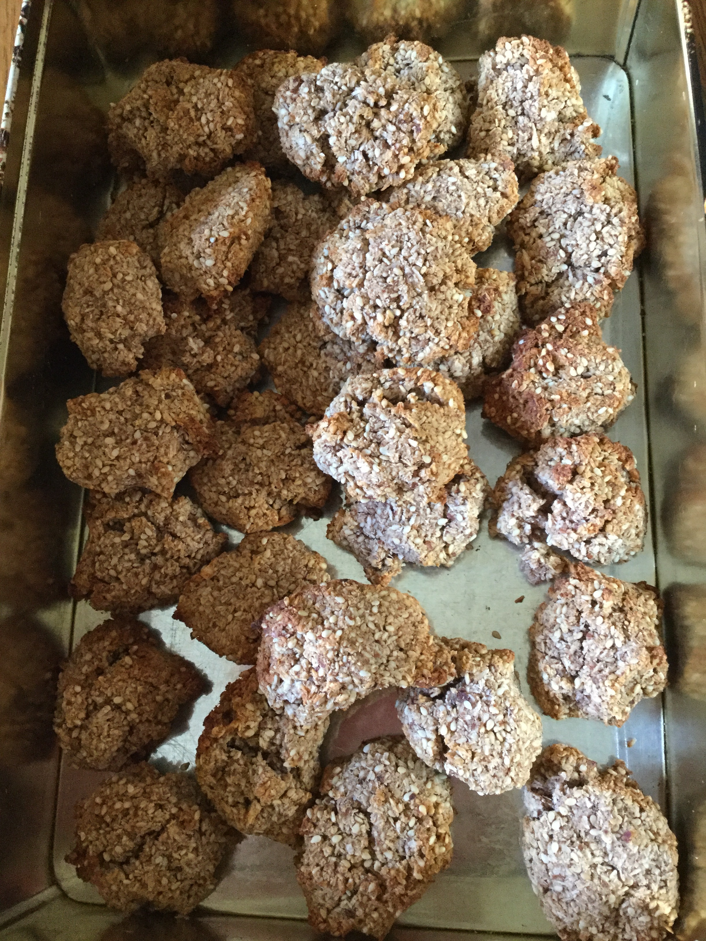 Banane mit der Gabel zermatschen, Öl und Zimt unterrühren und dann den Rest. Mit einem Teelöffel kleine Häufchen abstechen, auf ein Blech setzen, etwas platt drücken und bei 160 Grad O/U 15 min. backen.