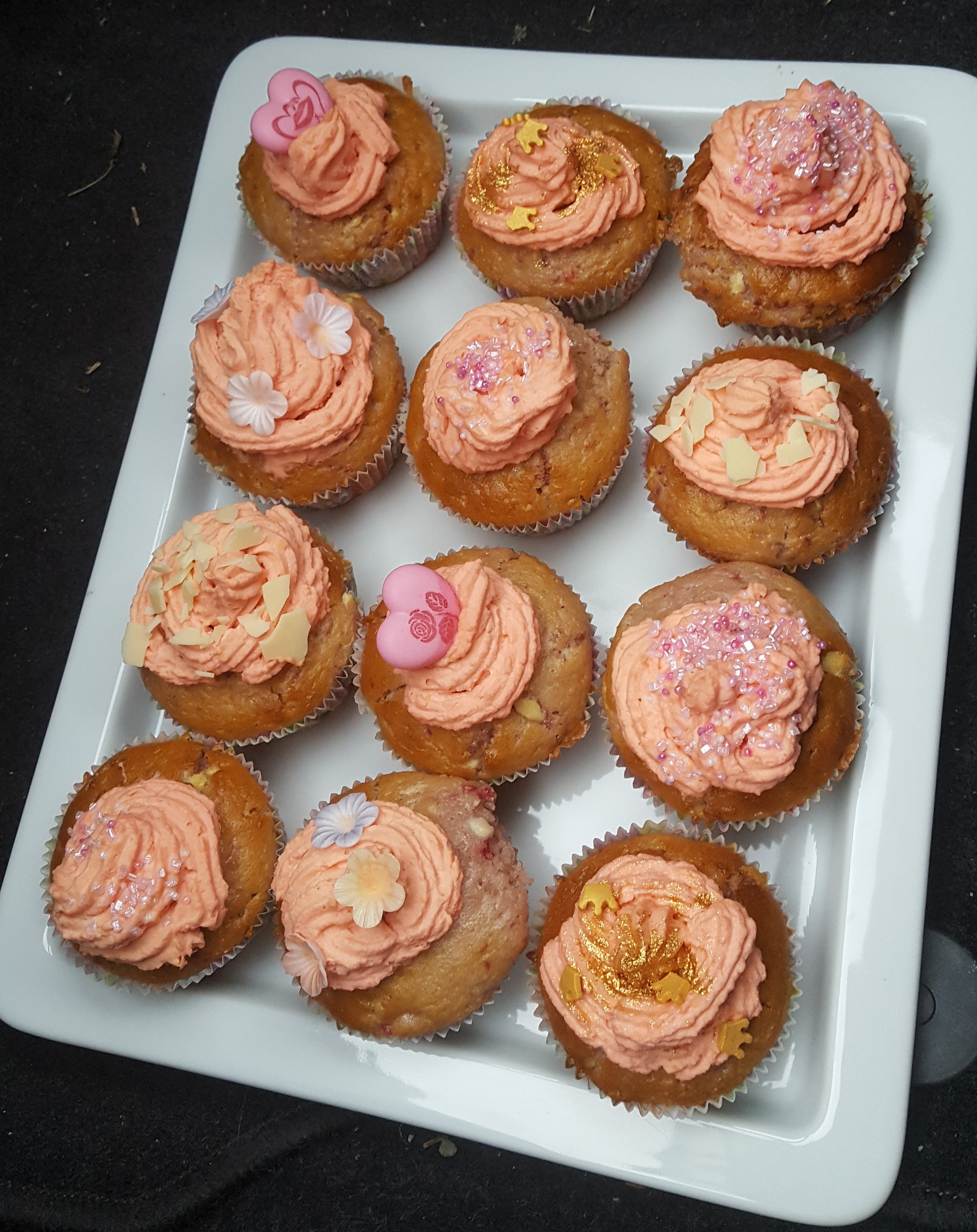 Das sind Himbeermuffins mit weißer Schokolade. Das Rezept habe ich in “Wenn’s einfach wär würd’s jeder machen” gefunden und sie waren wirklich lecker.