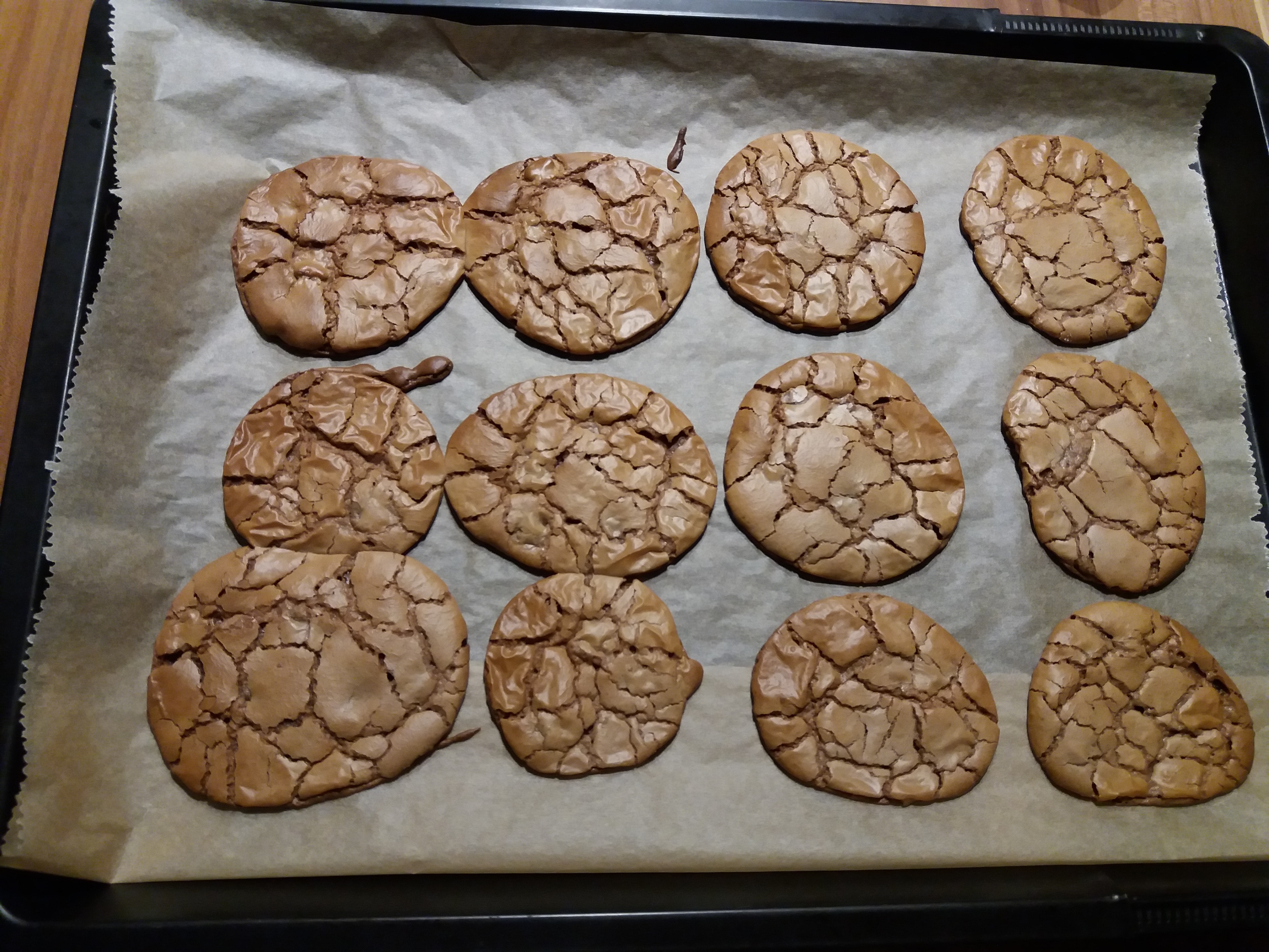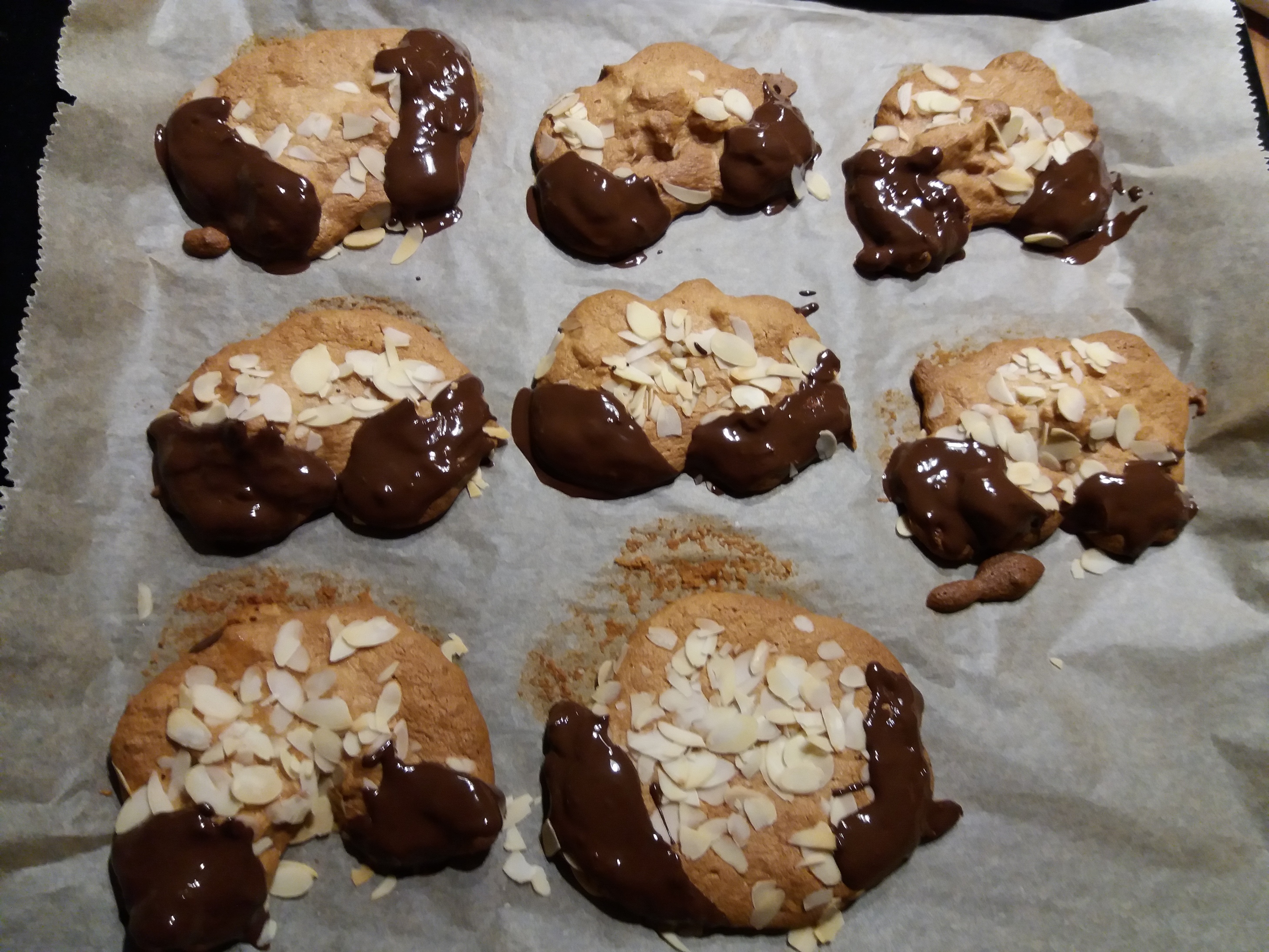 Schoko-Cookies und optisch äußerst unschöne Mandelhörnchen. Das Rezept lässt keine Schöneren zu. Zumindest ist der Teig so klebrig, dass er absolut unformbar ist. Konnte so gerade eben unförmige Flatschen auf’s Blech bringen…