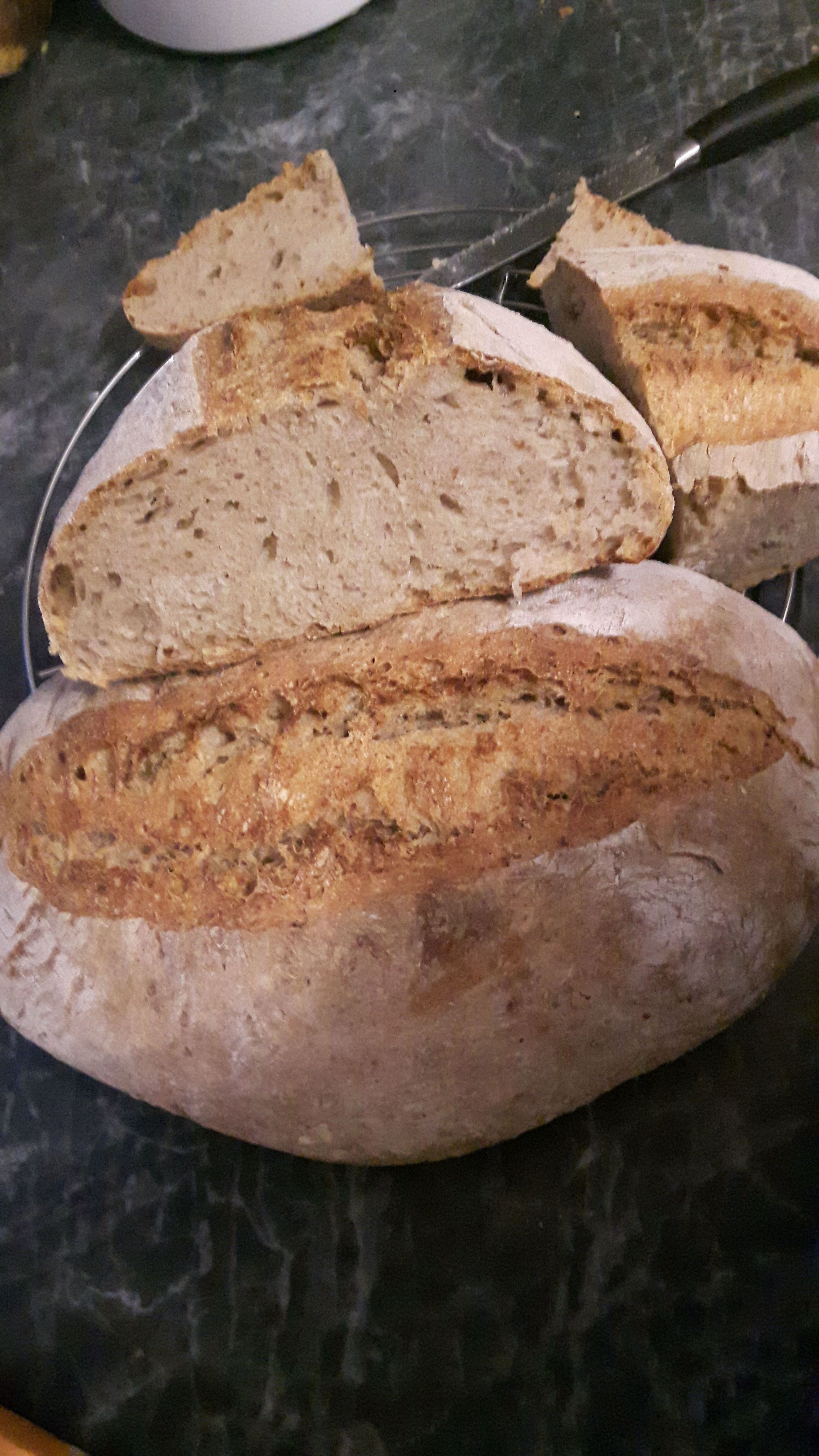 3-Korn-Mischbrot ohne Hefe nur mit Sauerteig. Ist total lecker. Werde ab sofort die meisten Brote mit Sauerteig und ohne Hefe backen.