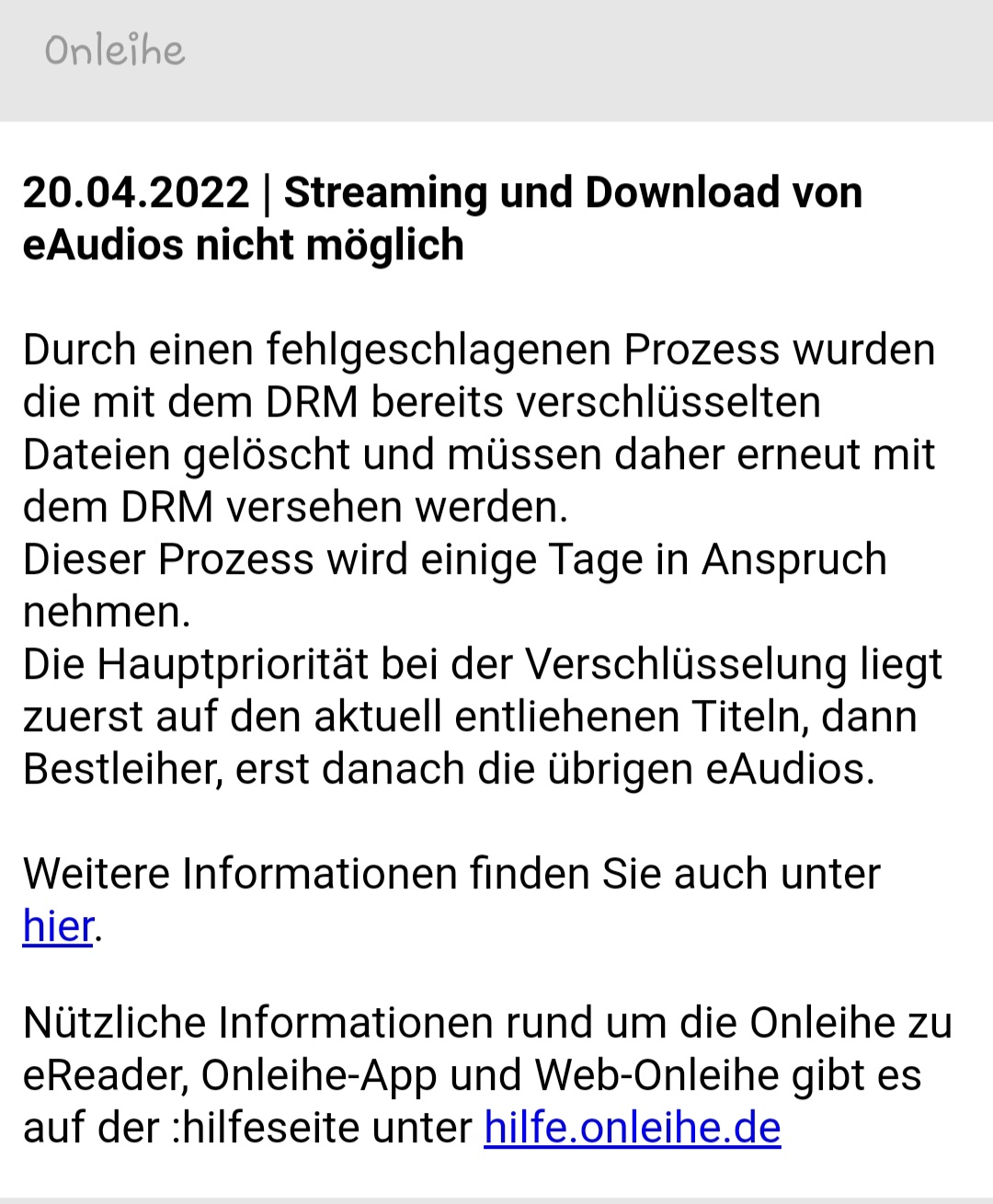 Meine Onleihe meldete, das sie ein technisches Problem haben und die Hörbücher alle neu laden müssen. Also die Onleihe. Und das es ein paar Tage dauern kann