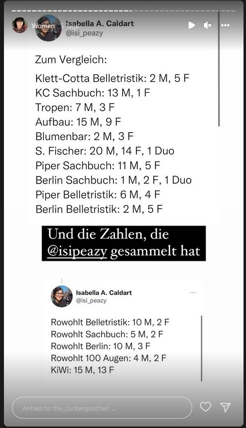 Und bei den Leserunden wird sicher auch nach Verkaufszahlen gegangen: NA und Liebesgedöns verkauft sich wohl am besten (sehe ich auch auf Insta: Unmengen solcher bookstagram-Accounts, die Tausende Follower haben)